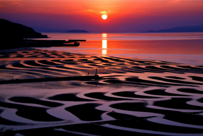 干満の差が激しい有明海でココのみと言われている絶景スポット。 潮がひくと現れるのは、風と波によって描かれる三日月型の模様。 夕陽百選、日本の渚百選。 全景は、御輿来海岸 展望所から見られ、年に10日あまりの絶景日には、国内外から多くのカメラマンが訪れます。 (注目シーズン:2~4月)