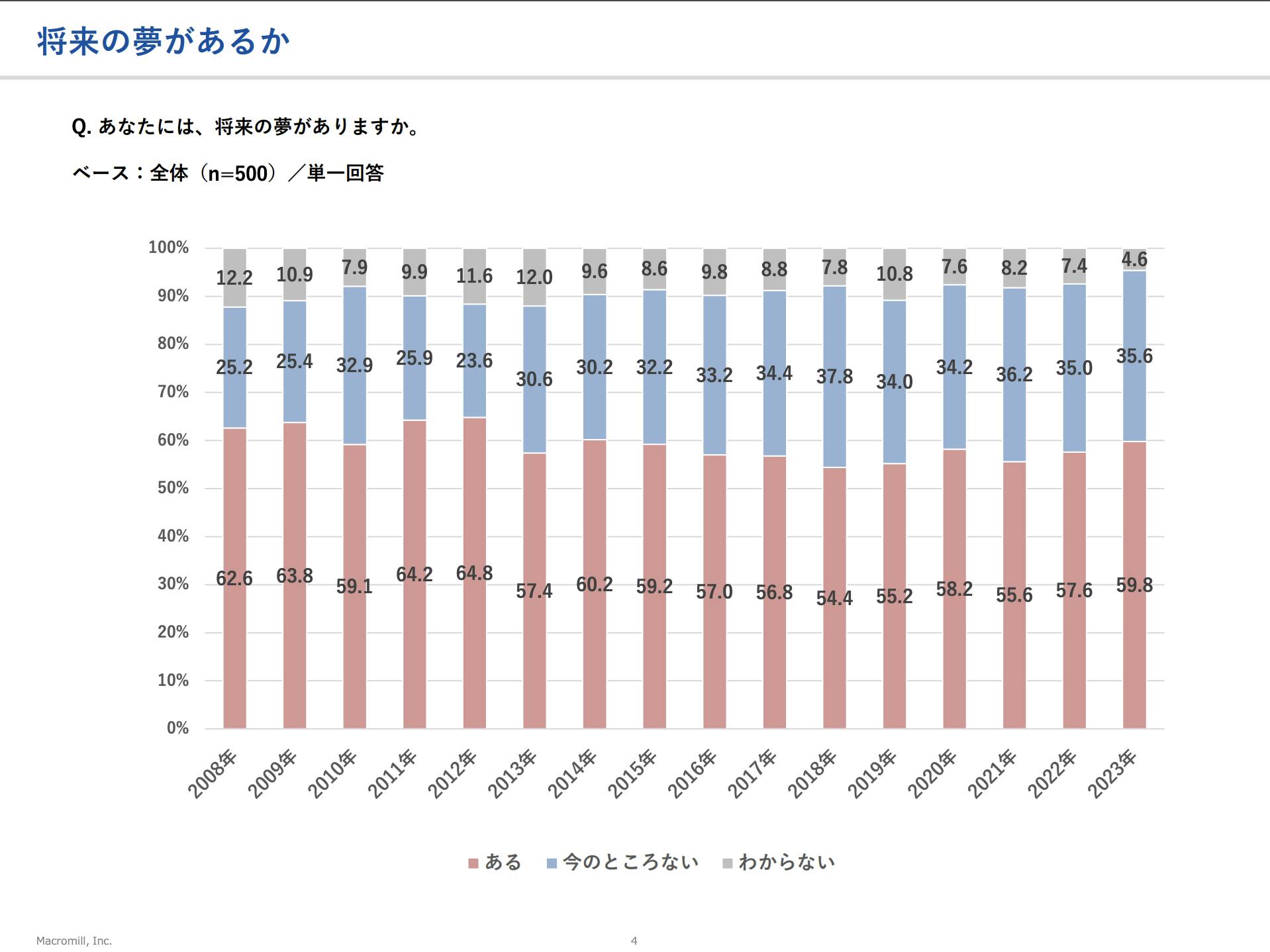 また、この15年の調査を見ても、一般的に『大人』と定義される新成人の約6割は夢を持っているそうです。