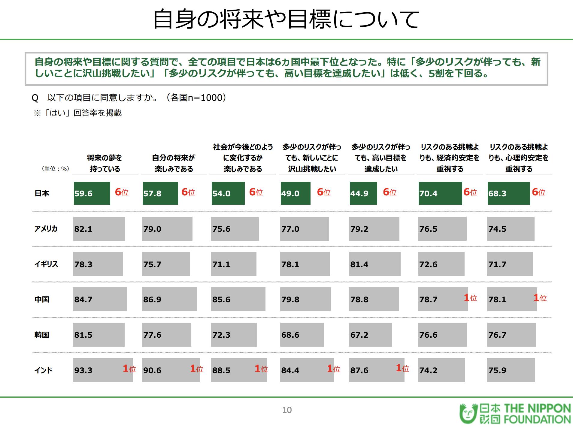 この調査は日本・米国・英国・中国・韓国・インドの17歳~19歳男女各国1000名を対象にした調査で、マクロミルの調査と同じく、日本人回答者の6割は夢があると回答しています。しかし、この6カ国の中では最下位であり、また自身の将来や目標についての科目で全て最下位という結果となっています。