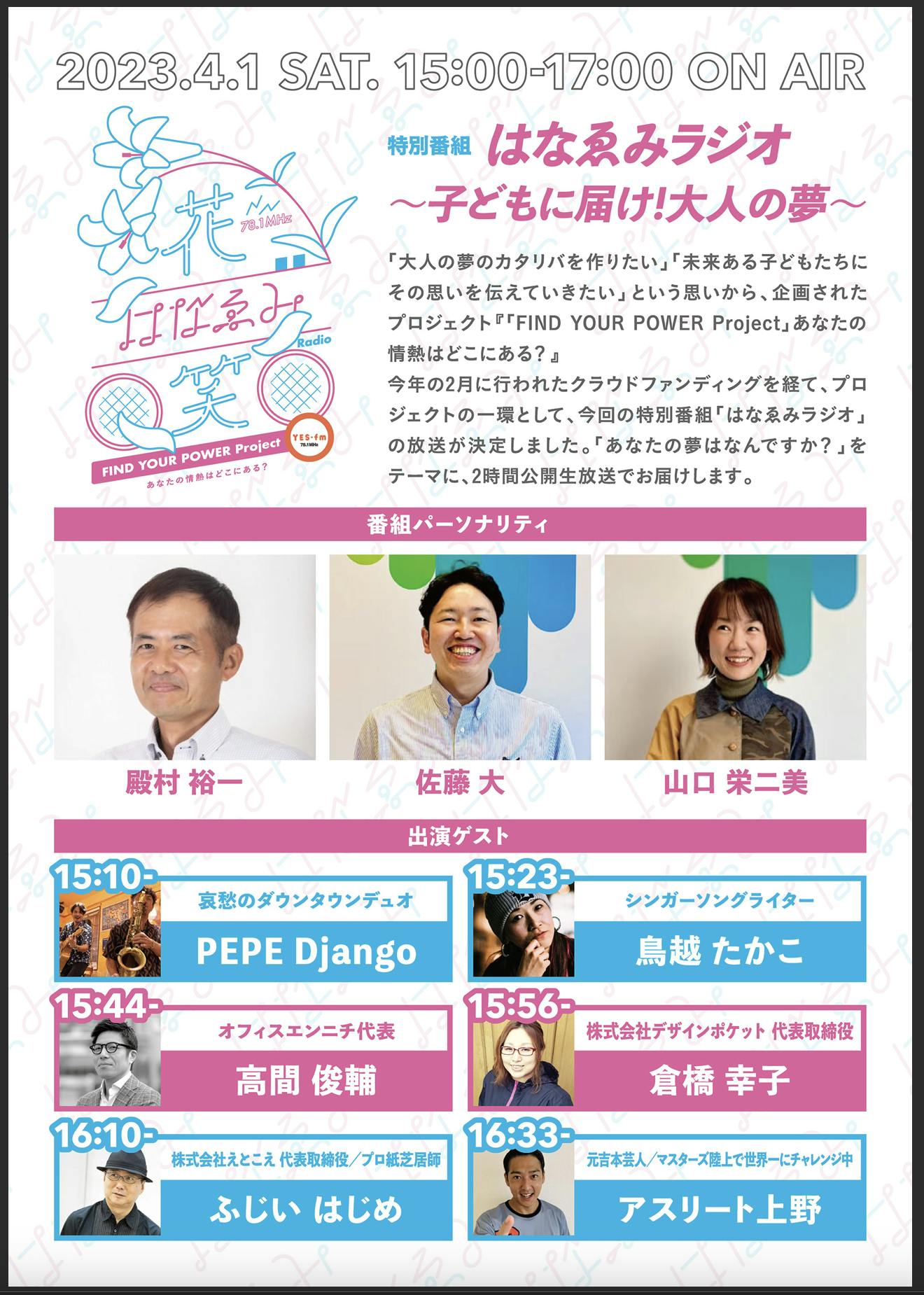 また、全国のコミュニティラジオと協力し、地域ごとに日本全国でこの「はなゑみ」が放送されるようになって、それぞれの夢や目標を語り合い応援できる社会の実現に役立ってほしいと願っています。