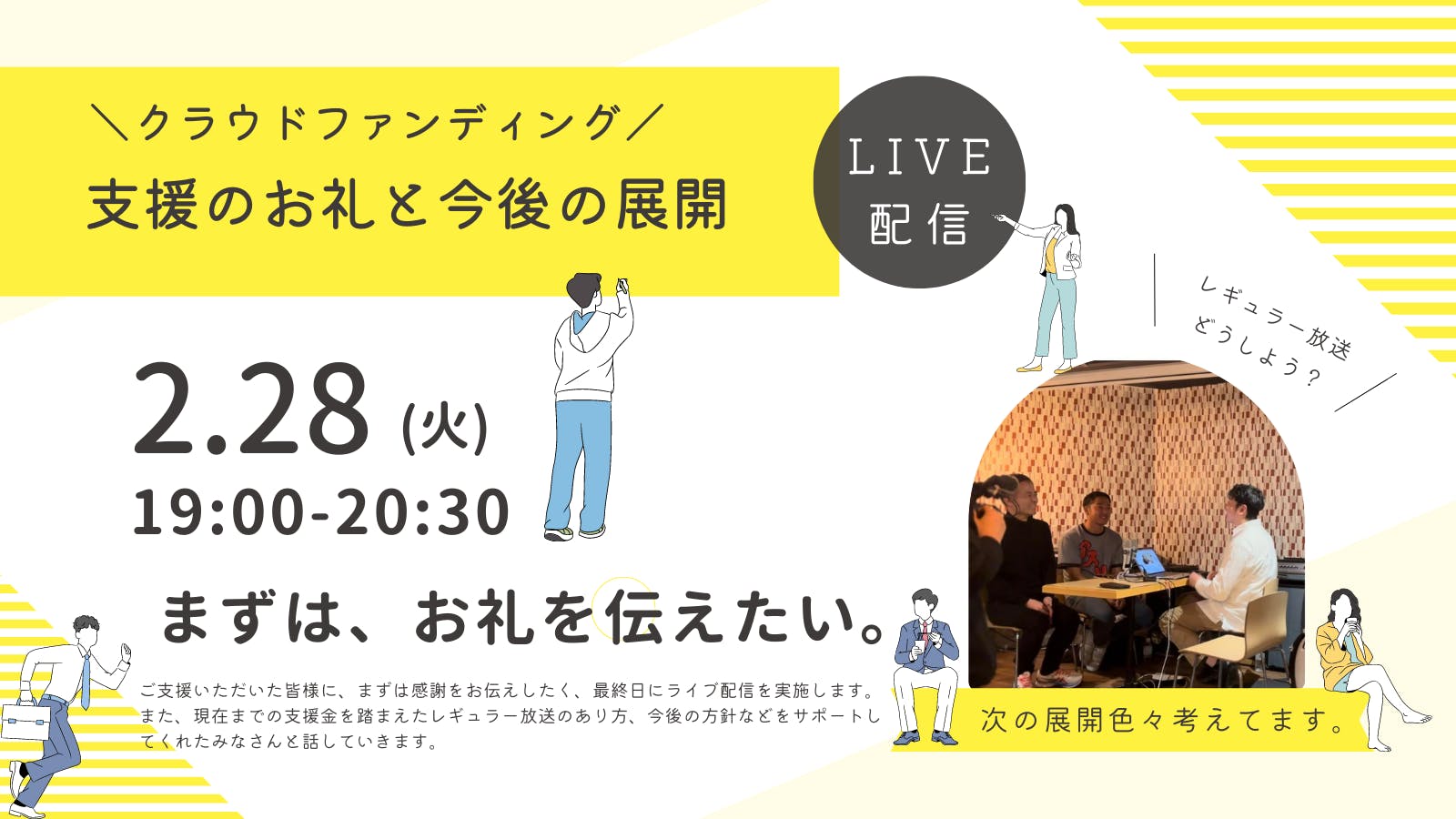 すでに多くの方に支援を頂いているのですが、現在の金額では4月1日の2時間番組の制作費やリターンの費用などでほぼ消えてしまうので、あと少しでも支援をいただけるように最後までやり切れたらと思います。