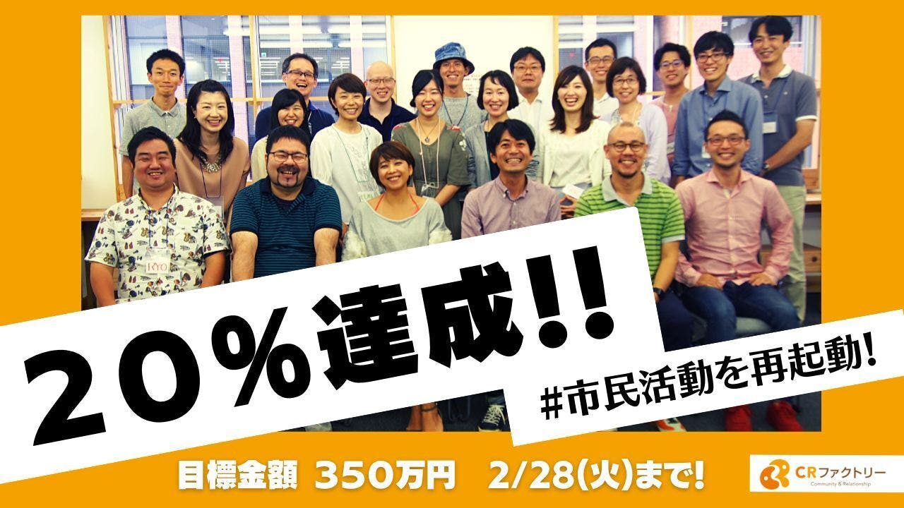 20%達成し、約100人の方が支援をしてくださいました。応援してくれて「がんばれよ」「一緒にがんばりましょう」「今こそCRファクトリーだよ」という声がたくさん聞こえてきて、心がうれしい時間を過ごしています。