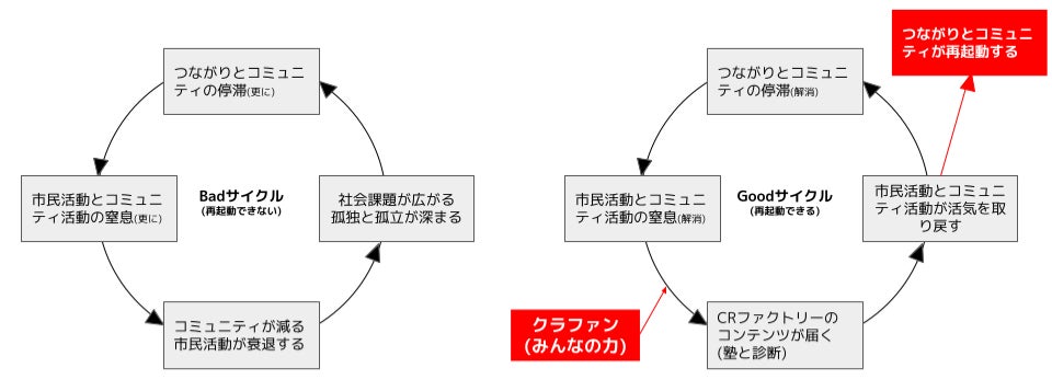 負の循環(サイクル)を止め、好循環を生み出していくためにCRファクトリーは役割を果たしたい。これからの市民活動・コミュニティ活動を盛り上げていく旗振り役となり、Withコロナ時代・Afterコロナ時代のつながりとコミュニティを豊かにしていくことに使命感を持って取り組んでいきたいと思います。それが15年以上に渡ってつながりとコミュニティをテーマに取り組んで来た私たちの責務だと思っています。
