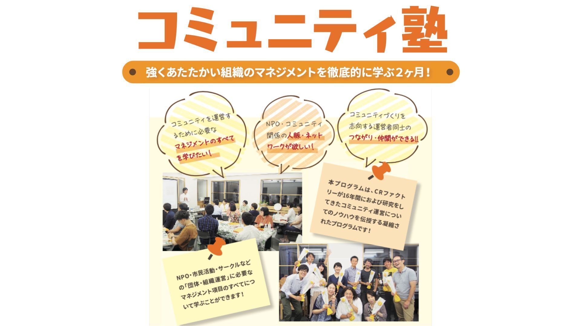 具体的にはCRファクトリーが独自開発して10年以上に渡って提供してきた「コミュニティ塾」と「コミュニティキャピタル診断」を中心に、さまざまな組織基盤強化支援を全国のNPO・市民活動・地域活動・サークル活動に向けて届けていきます。
