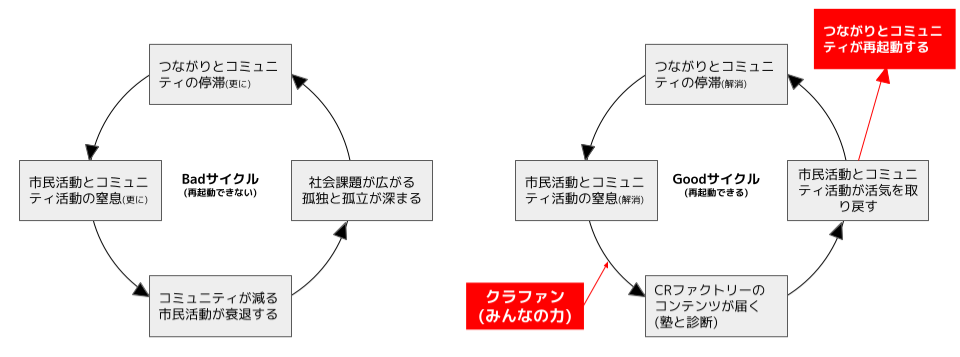 負の循環(サイクル)を止め、好循環を生み出していくためにCRファクトリーは役割を果たしたい。これからの市民活動・コミュニティ活動を盛り上げていく旗振り役となり、Withコロナ時代・Afterコロナ時代のつながりとコミュニティを豊かにしていくことに使命感を持って取り組んでいきたいと思います。それが15年以上に渡ってつながりとコミュニティをテーマに取り組んで来た私たちの責務だと思っています。