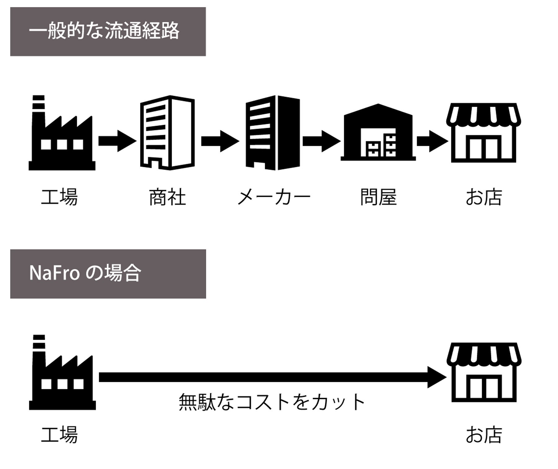 私たちは大手ブランドとは異なり、流通経路をシンプルにし生産地からユーザー様へダイレクトにお届けすることで無駄なコスト分を還元する仕組みを構築しています。