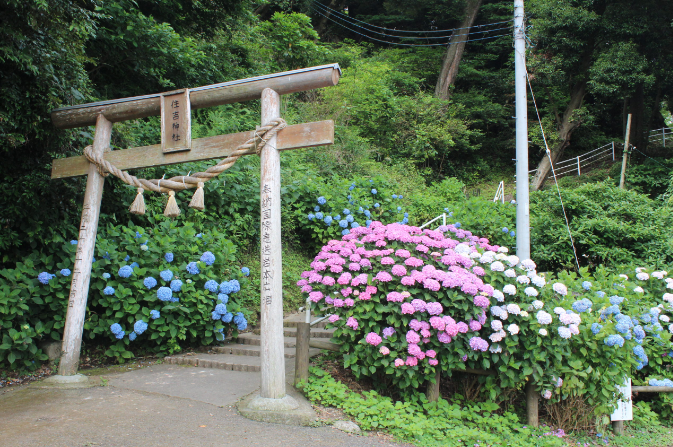 住吉自然公園では、地元の人たちによって約2,000株のあじさいが植えられ、6月上旬になると県内各地からその美しさを楽しみに多くの方がいらっしゃいます。 公園内には、900年の歴史がある住吉神社に海の神様が祭られていたり 5~7月には、野生のムツゴロウが出現するなど四季を通じて公園内には魅力がたくさんあります。