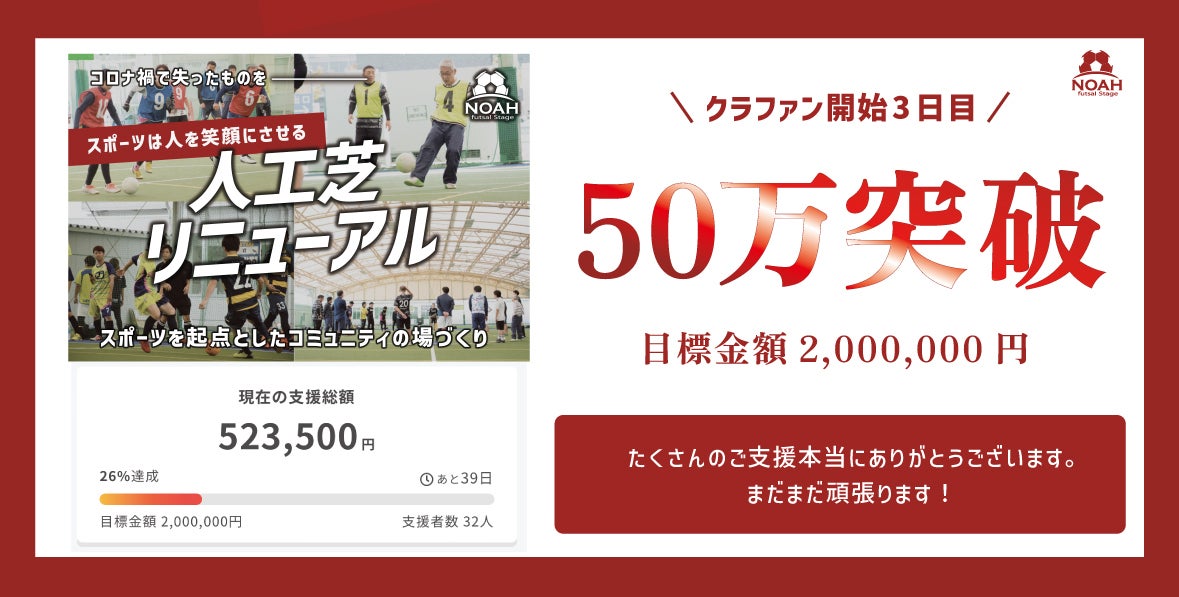 こんばんは!冷蔵庫に入っている強炭酸水を開封すると、瞬間凍結!!その瞬間を見て、興奮したのがつい最近。mariyaです。さぁ今日は、みなさんに緊急報告!本日2月4日は、記念すべき日になりました。なんと本日.....支援者96名さま!!ファーストゴールである200万円を突破しました!!!!皆様、ご支援本当にありがとうございます!皆様のおかげでここまでこれました。ということで.....一言いよろしいでしょうか?......ほんっっっっとうに    嬉しいです!!!!!!!!!!まず、ご支援していただいた96名の方。本来様子見したくなるところ、この早いタイミングでご支援いただき、本当にありがとうございます。そして、支援を検討していただいている方このページをご覧いただきありがとうございます。(このページをご覧いただいてるってことは...........笑 お待てしております!)わたしたちはネクストスゴール300万円に挑戦します。ノアを、ひとりでも多くの方に知ってもらいたい。ひとりでも多くの方にフットサルを通じて、ノアという施設を通じて笑顔になってもらいたい。まだまだ挑戦し続けます!そして今回のご支援が、あのとき支援しておいてよかったな...と思っていただけるように、常に進化し続けていきます!まだまだご支援、拡散のご協力よろしくお願いします!悩んでいる方は、お気軽にスタッフまでお声かけ またはメッセージをお送りください!それではままたお会いしましょう!(200万円記念は別途お知らせ!忘れてませんよっ!)