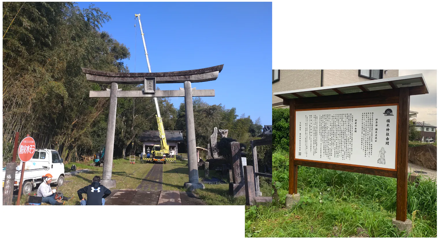 最後に残っていた鳥居右側にある案内板の改修も行われました。さつま町文化財ボランティアガイドの方々に以前あった内容の編集をお願いし、楠公さんご神体の挿絵と弊会のQRコード入りとなりました。とても立派なものが出来上がったと思います。