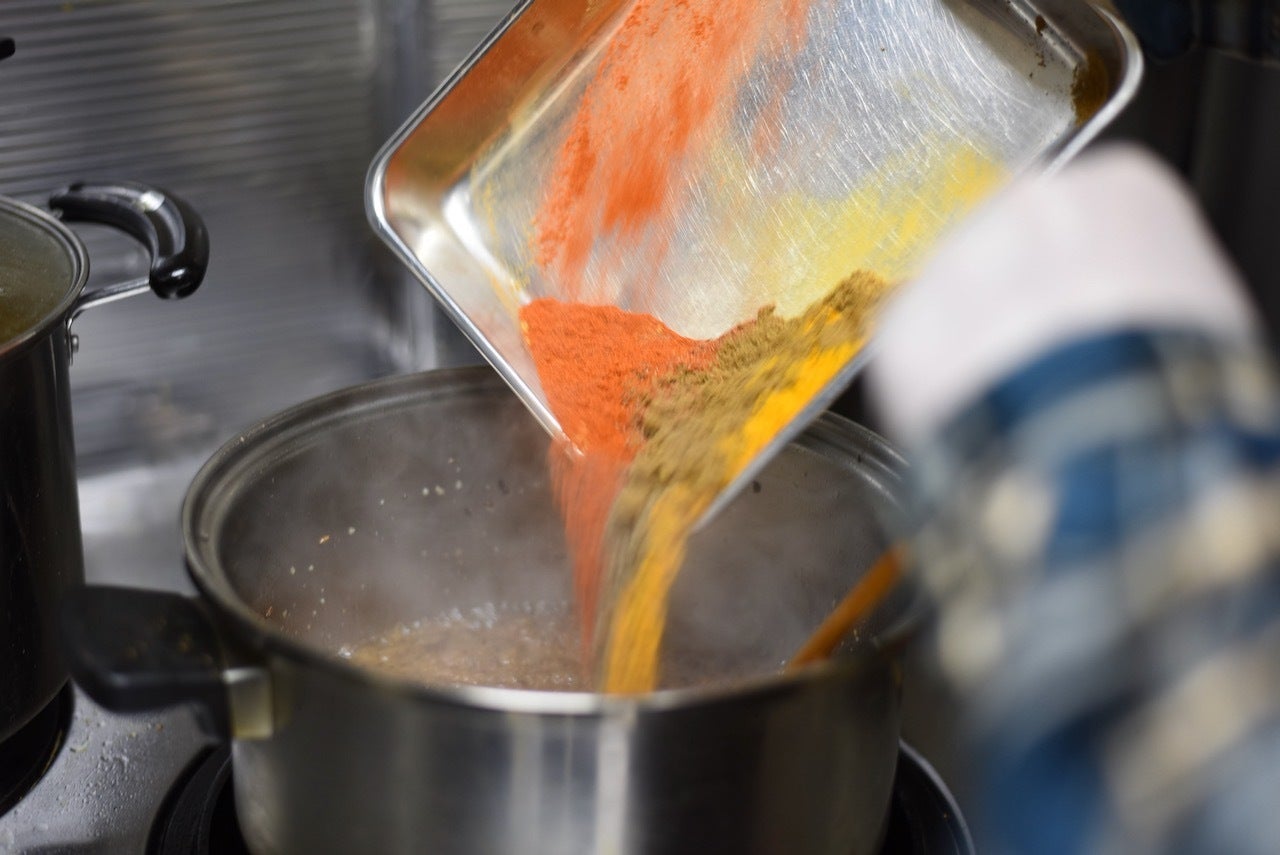 数種類のスパイスを入れますが、香りが失われないよう調理時間は手早く