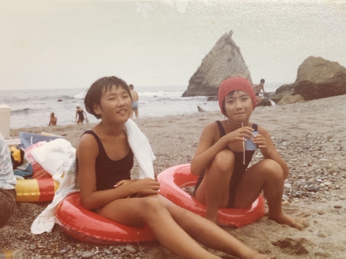 夏休みは、従姉妹たちと末続海岸で泳ぐのがお決まりでした。右が私です