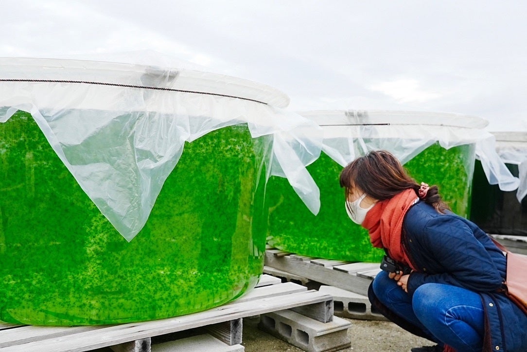 美しい色をしている陸上で育てられているきぬ青のりを見学させてもららいました!