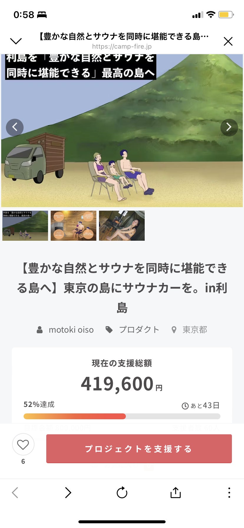 サウナカーのご支援、応援した頂いた皆様この度私たちの叶えたい夢に、皆様の貴重なお金と時間を使い宣伝して頂き誠にありがとうございます。皆様のおかげ公開3日で目標金額の50%達成を実現できました!マラソンに例えると今の地点は、折り返し地点からゴールへ向かっていく最中だと思っています。今回クラウドファンディングに挑戦を決めてから実際に公開してからもマラソンそのものだなと感じる機会が多くありました。自分1人で走っているように見えても、人間1人で出来ることなど限られていると改めて感じさせたれました。公開するまで協力してくれたスタッフ、友人、島内の先輩方。公開してから走っている私たちに温かい応援をしてくれたり、共に伴走してくれたりする人もいる。マラソン選手は、1人では走りきれないと気付かされました。私たちも同じです。1人で出来ることなんて限られていると思います。最後まで完走できるようにお一人お一人の応援とご支援をよろしくお願いします。皆様の気持ちを背負い、目標金額までゴールし、絶対成功させます。プロジェクトリーダー大磯 元希