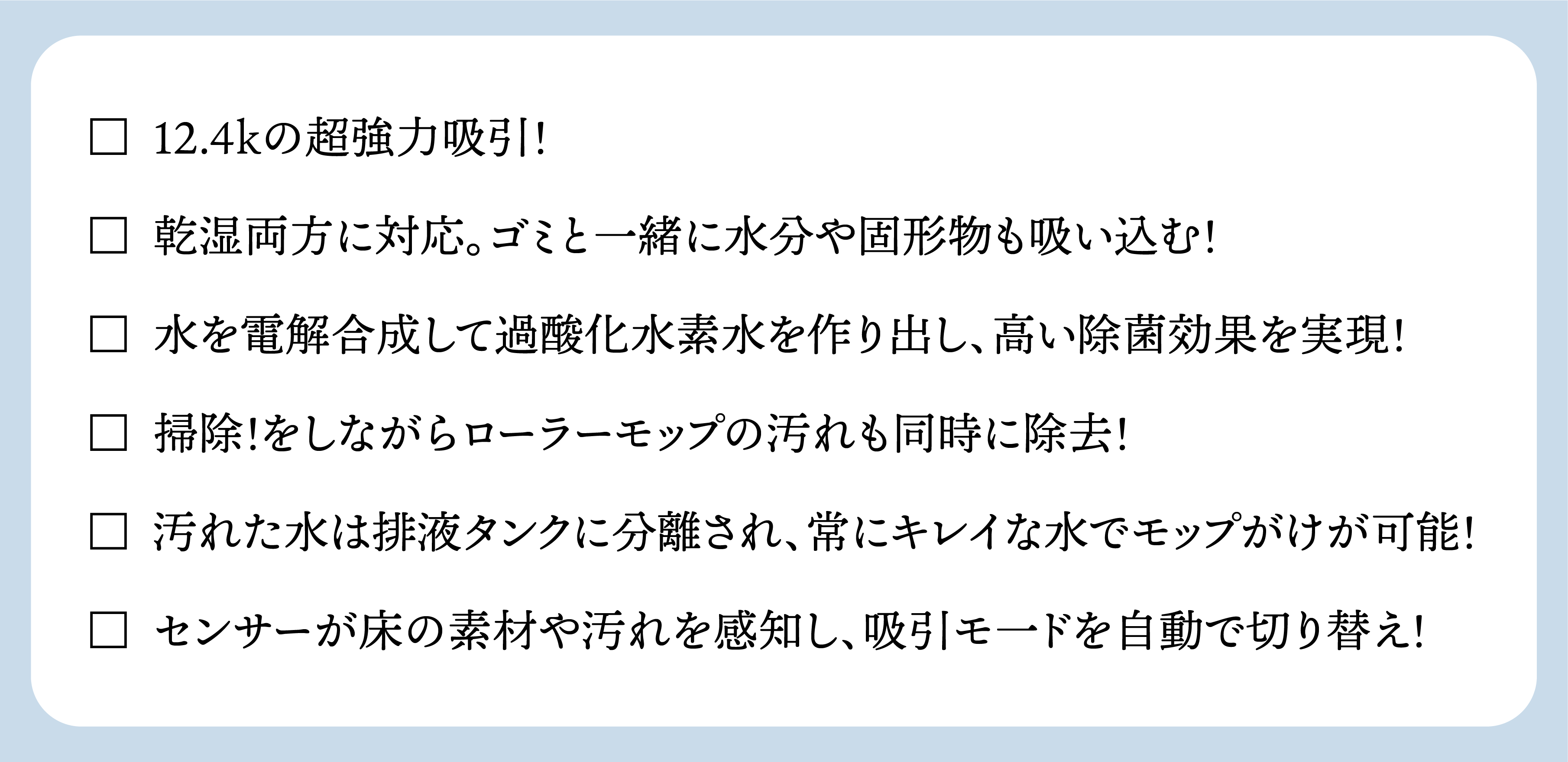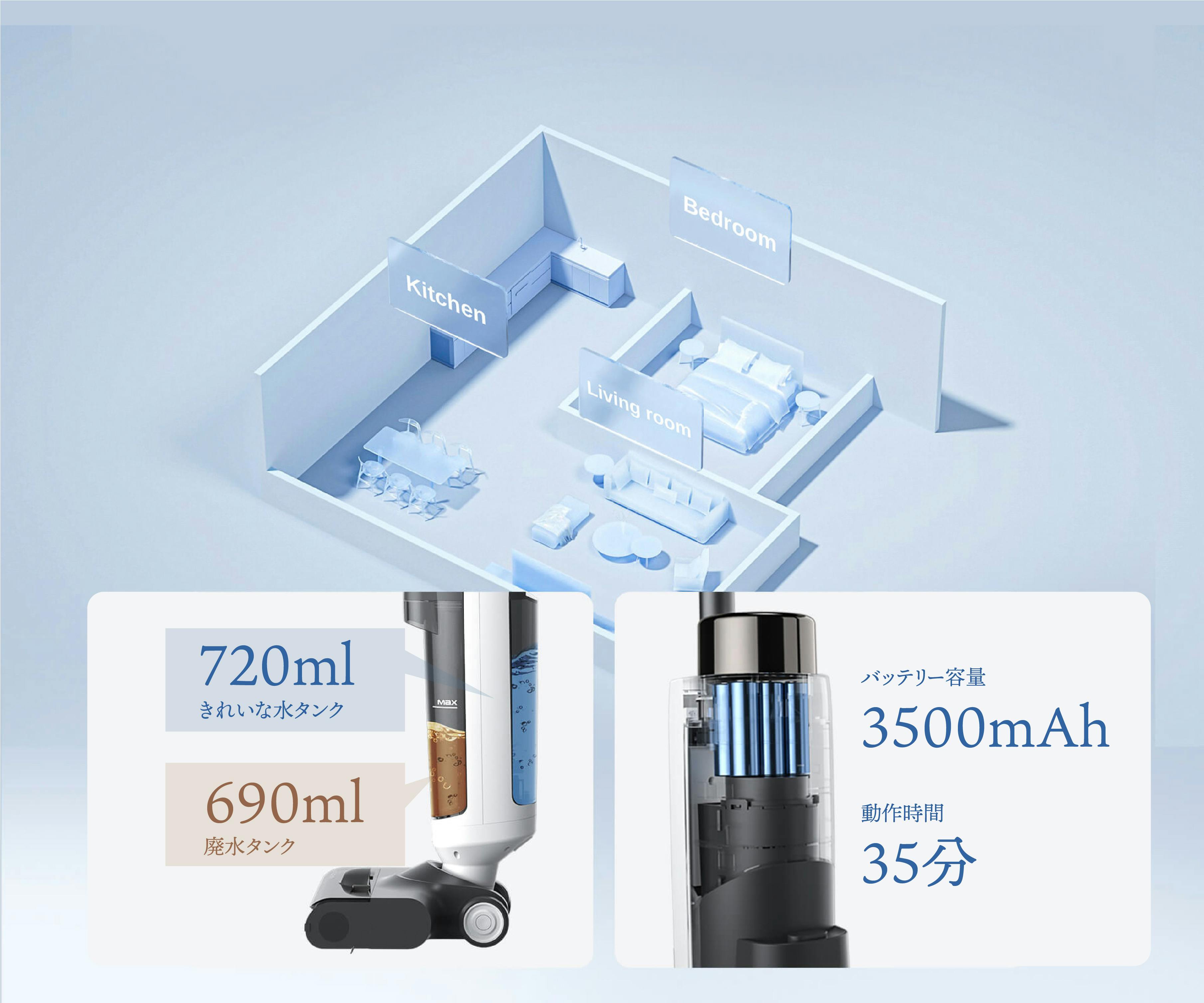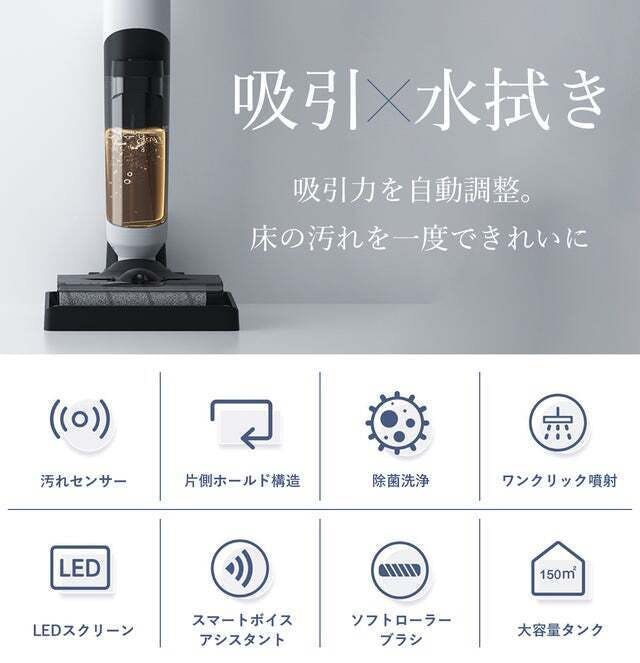 固形の食べこぼしは箒や掃除機で、液体の飲み物は雑巾やモップで拭き取りというのが従来のやり方ですが、掃除機掛けと拭き掃除を全て1台で完結させることに成功しました。