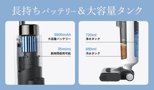 水を入れるためもタンクも大容量の720mlとなっているため、掃除の途中で水がなくなってしまう心配もありません。