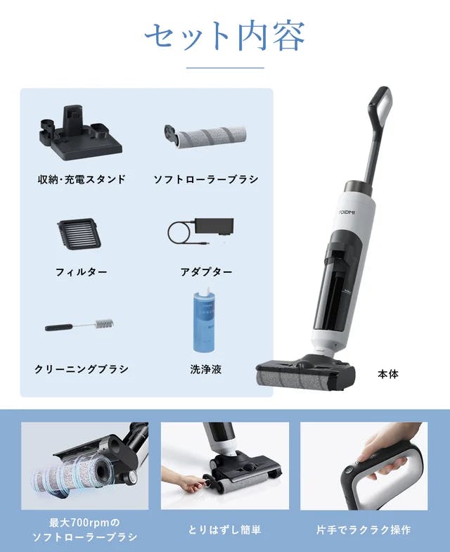 〈付属品〉収納・充電スタンド / ソフトロ一ラ一ブラシ / フィルター / 電源アダプター / クリーニングブラシ / 床洗浄液
