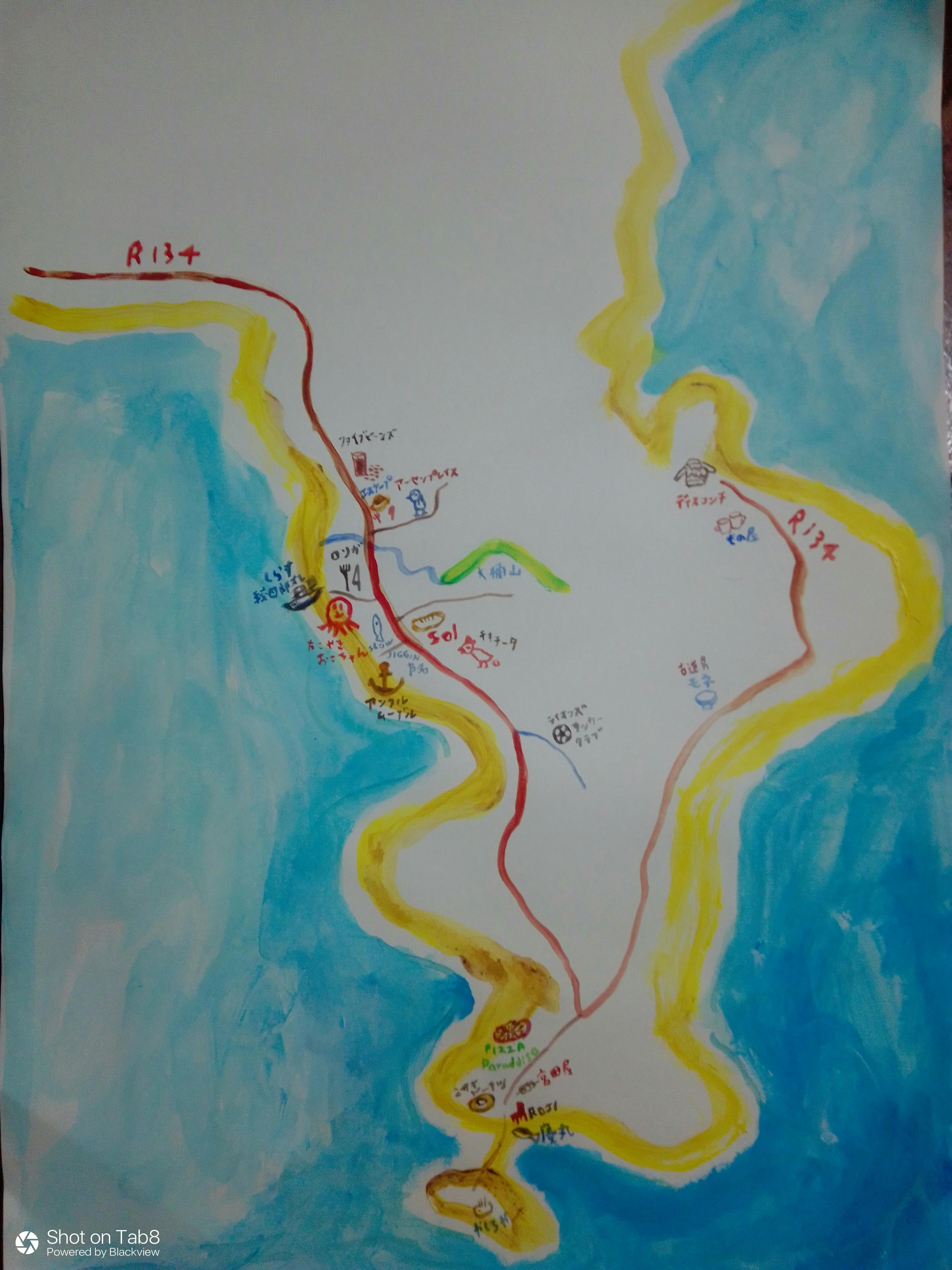 おこちゃんがお世話になっているお店に置かせてもらったり貼らせてもらったり三浦〜横須賀〜葉山〜逗子〜鎌倉を巡って、地図に描いていっているところです(たこやきおこちゃんのデザインは全て、絵描きの夫にお願いしているのですが、私がイノシシのように突進しているので行かせてもらったお店は全て描ききれていません!!順に描いていってもらいます。)