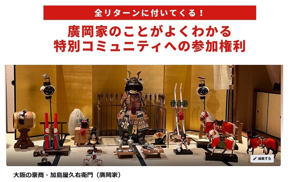 今回のプロジェクトでリターンを支援いただいた方は全員、特別コミュニティ(Facebookの非公開グループ)へ参加いただけます。このコミュニティには、今回のプロジェクトの支援者と、廣岡家の研究者・応援者が参加予定です。コンテンツとして、廣岡家文書にまつわる解説や今後の新しい発見があった際の報告、また、関連するセミナーやイベントのご案内などを検討しております。