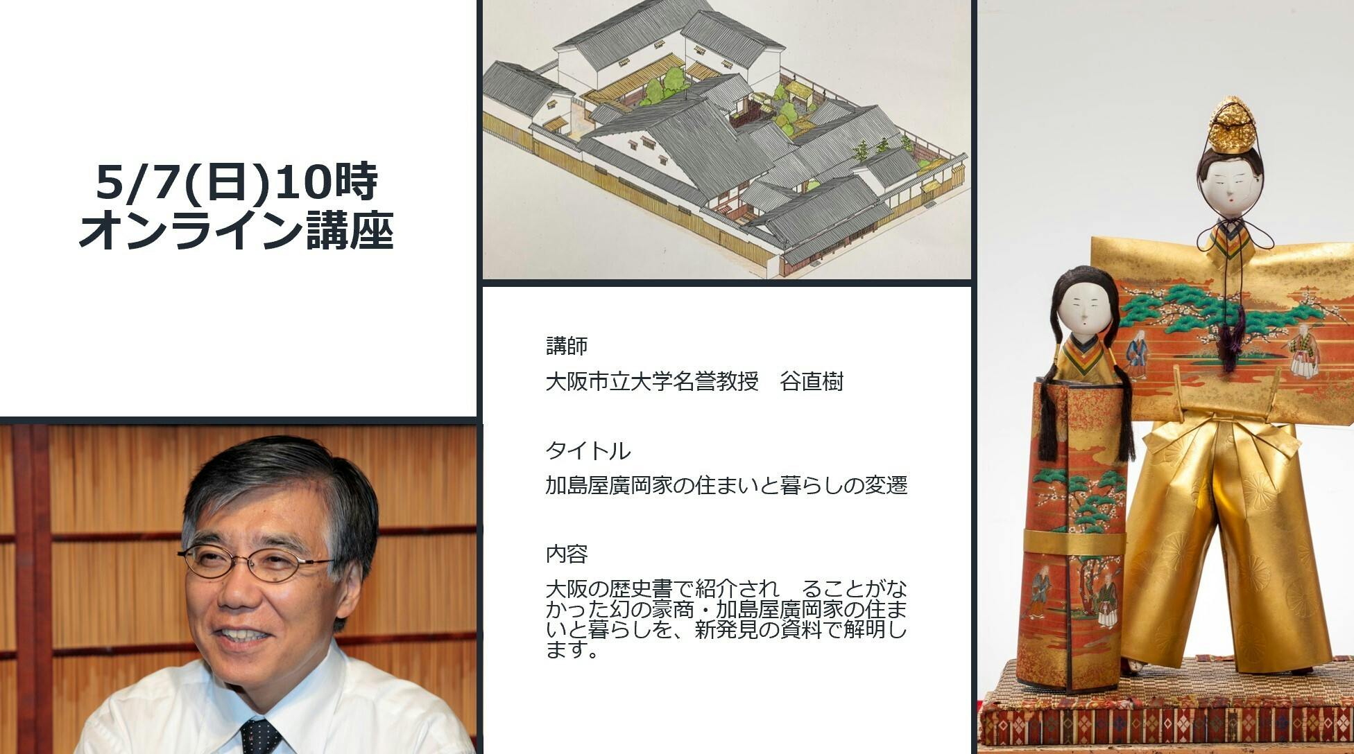 ・内容:幻の豪商・加島屋廣岡家の住まいと暮らしを新発見の資料で解明します。