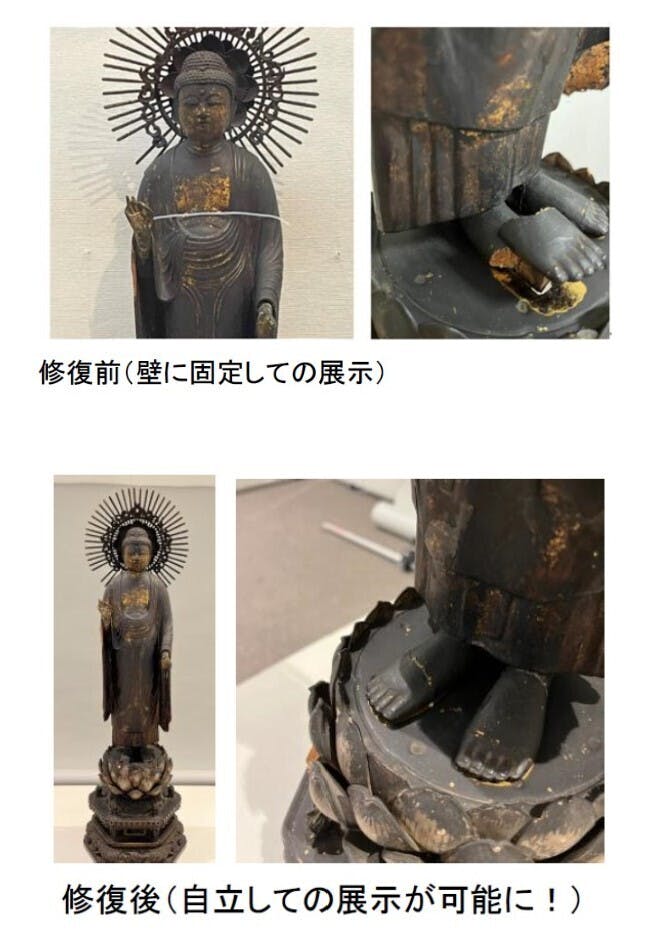 廣岡家の阿弥陀如来像は、皆様のお陰で応急修復が終了。自立して展示出来る状態に回復しました。その他、西本願寺門主裏書きの「方便法身像」の掛け軸(360年前)の修復も今年7月末で完了予定です。