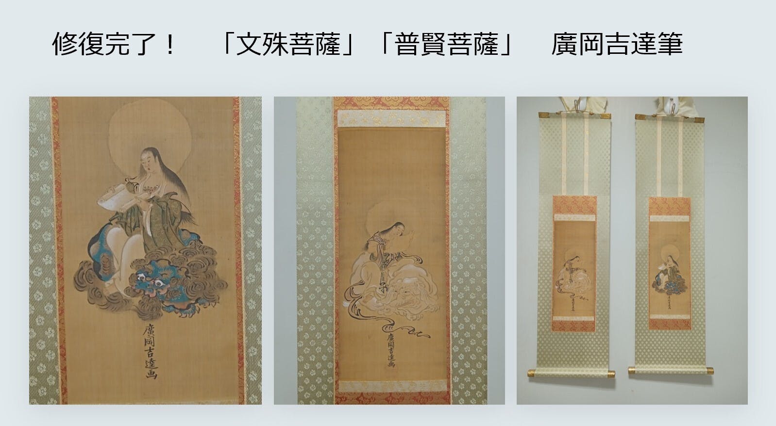 その中で、ご先祖様の3代目久右衛門・正中(吉達)が描いた「文殊菩薩」「普賢菩薩」の修復が完成しました。この画はボロボロでしたが、藤枝春月氏に修復して頂き、新品のようにキレイになりました。2本並べて掛けると対だったことが分かります。左側の穴あきの掛け軸を掲げているのが修復を依頼した藤枝春月氏です。有り難うございました。