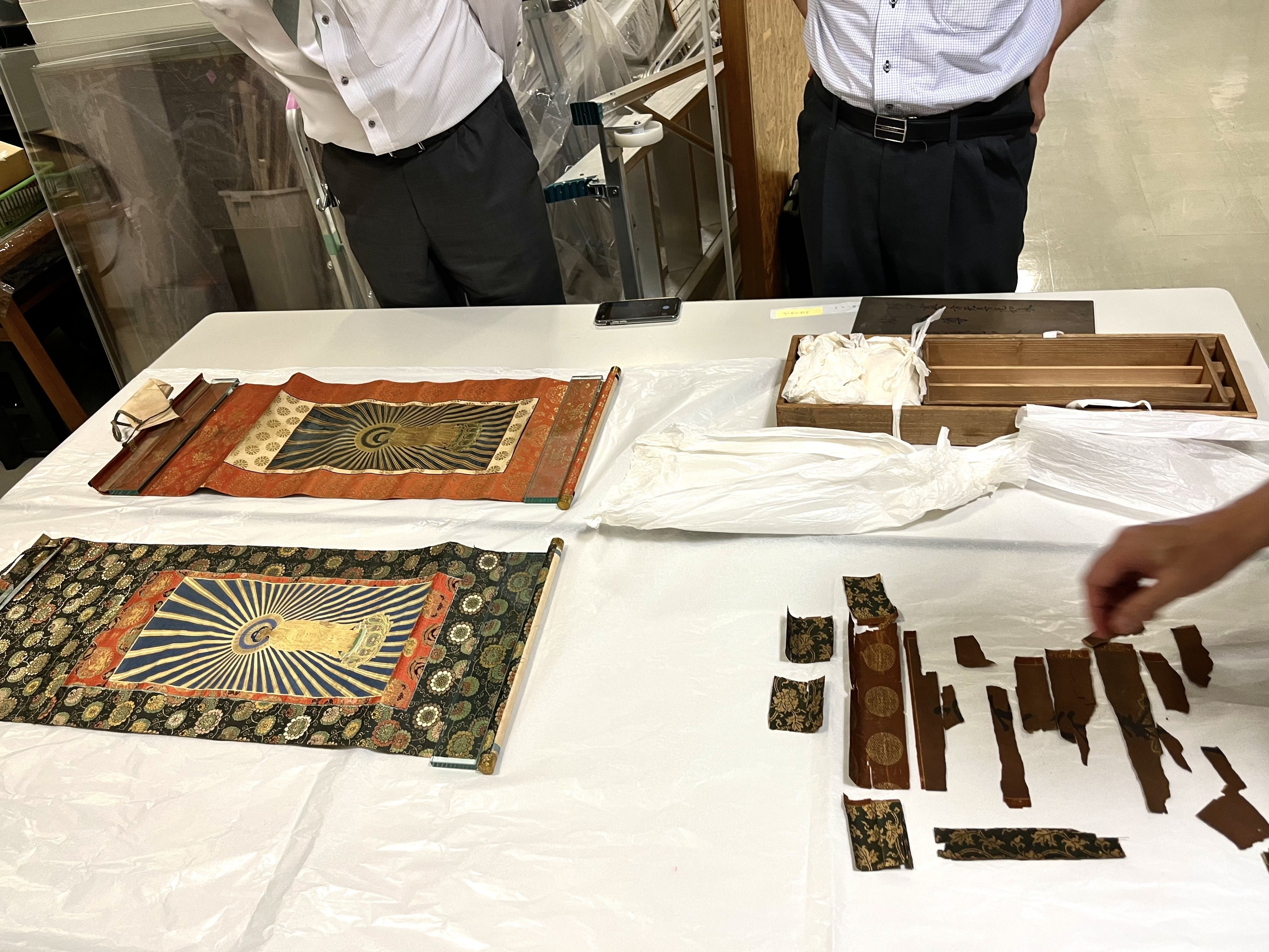 皆様、ご支援有難うございます。昨日、西本願寺門主裏書きの「方便法身像」を二幅とも光影堂さんに修復に出しました。クラウドファンディングでは1幅の予算で皆様の支援を頂いたのですが折角なら、やはり2幅とも修復したい!なので、「2幅とも出すので~」と値段交渉。谷先生の交渉と光影堂さんの「修復したい!」「支援したい!」と言うお気持ちで大サービスして頂きました。本当に有難うございます。予算オーバーですが、それでも修復したいので嬉しいです。ところで、「方便法身像」2幅 が納められていた木箱は3幅用でした。2幅しか入っていなかったのですが、もう1幅の残骸らしきものが残っていました。並べてみると、文字が書かれたお軸のようです。こちらの修復は無理と思いますが、何かが判るかもしれません。楽しみです。続く~今日もご先祖様のお力添えを頂戴できますようにお願いします。大阪の豪商・加島屋 第10代 廣岡久右衛門正直の孫神戸中医学院(芦屋薬膳)代表 西野久子(旧姓:廣岡)
