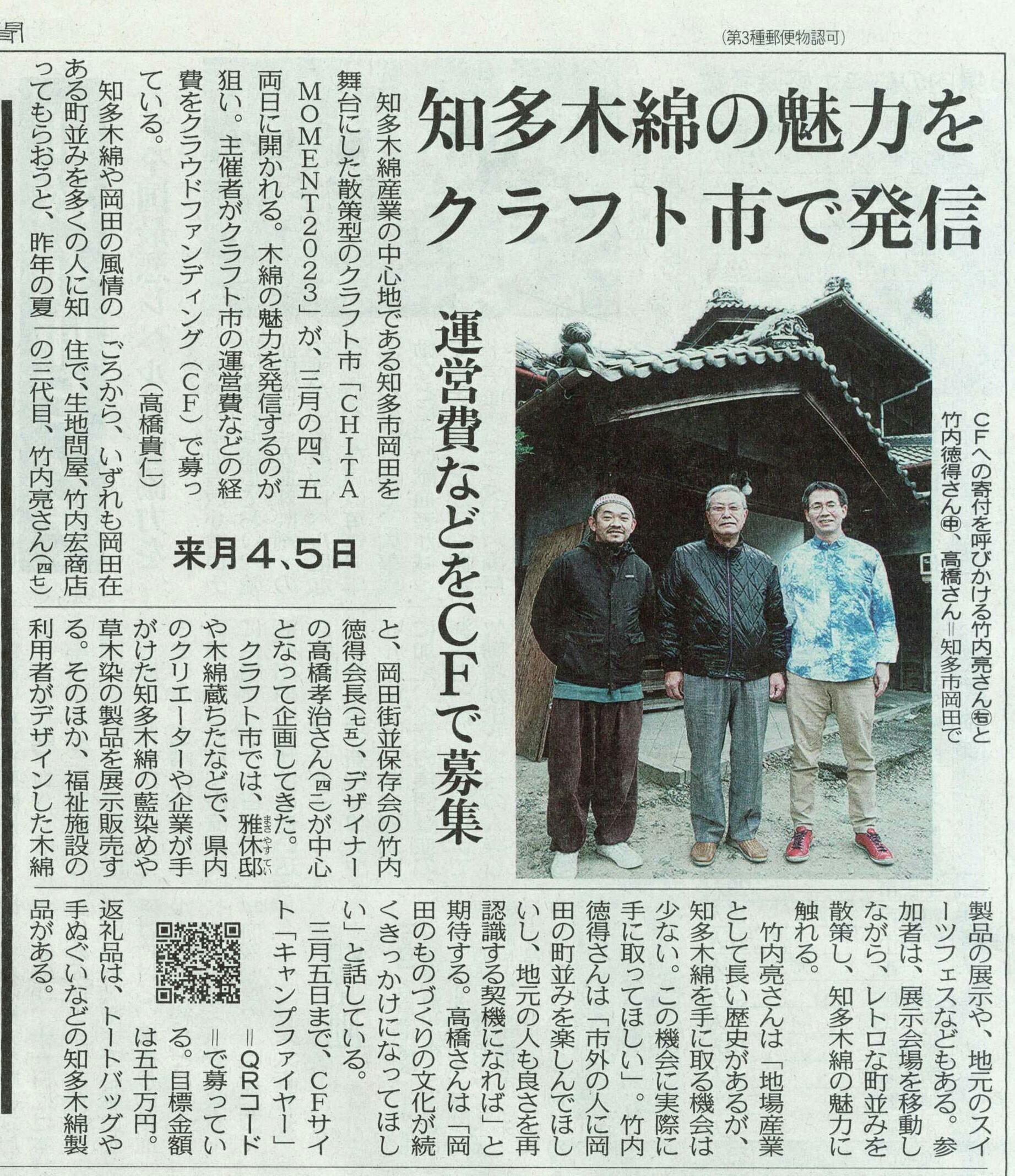 2月4日(土)中日新聞朝刊にCHITAMOMENTの生地がカラーで掲載されました。新聞を見ていただいた皆様からもさっそく支援をいただけ感謝しております。引き続きイベント向け頑張っていきます!