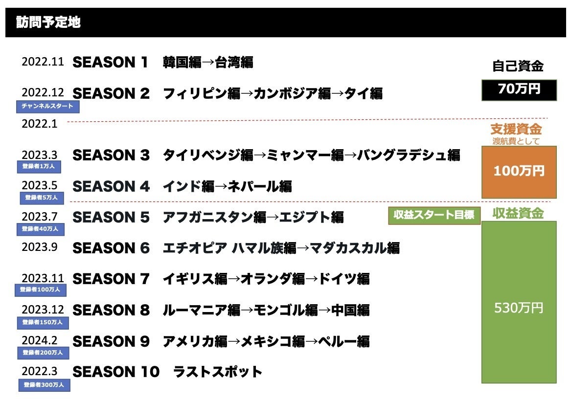 このプロジェクトは最終的にYoutubeやその他SNSに纏わる収益で地球1周を目指す事を目的としていますが