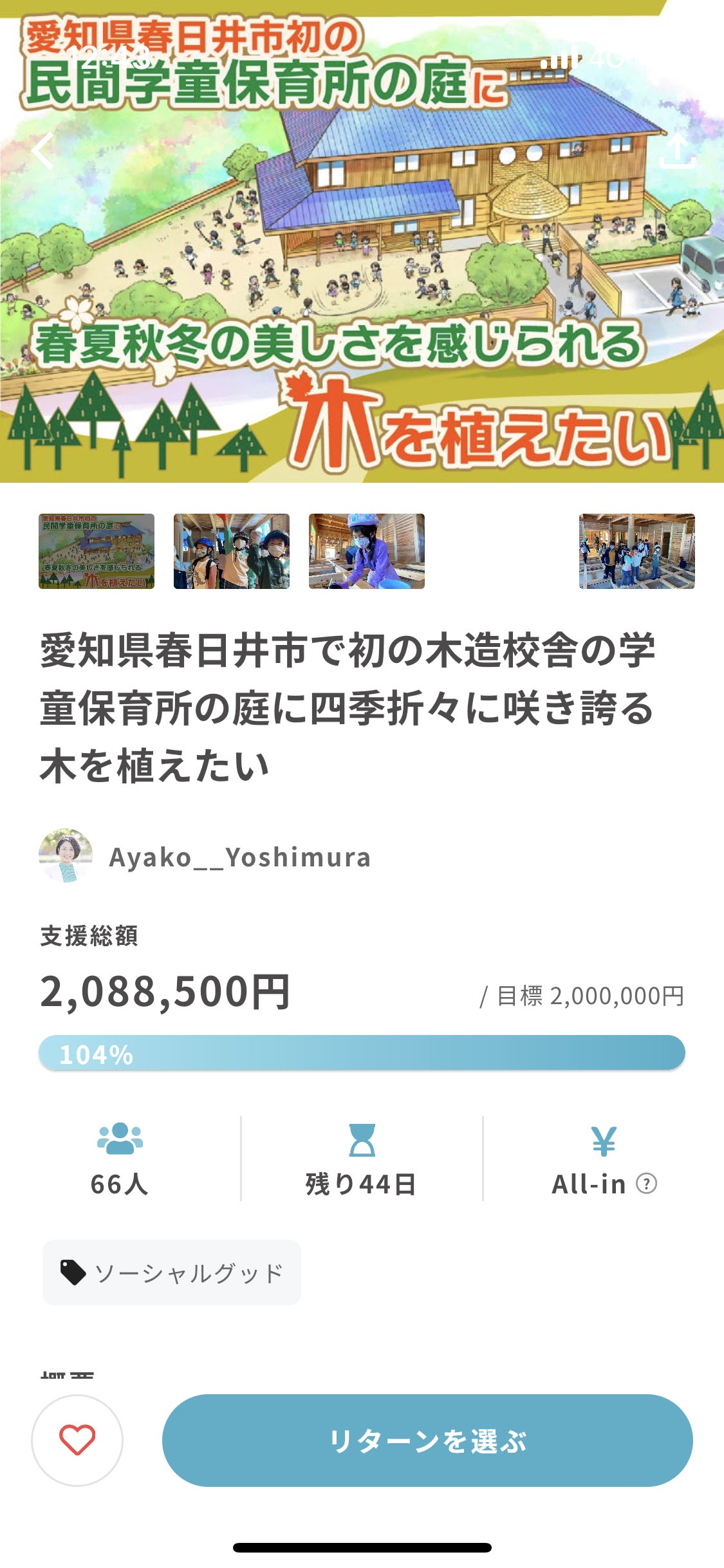 2023/05/16 09:00おはようございます。クラウドファンディングを始めて、6日目。みなさまの温かいお気持ちに感謝の気持ちでいっぱいです。ありがたい事に私を気にかけてくれる方がたくさんいて、その方々から『あやちゃん!頑張ってるね!何かお花でも送ろうね』とお声かけをたくさんいただきました。今まで、法人なりをした時もたくさんの胡蝶蘭やお花を頂戴しました。とても嬉しくてとてもとてもありがたく思いました。スタッフ、子どもたちや、保護者の方々から『あやこ先生、凄いですね!』って言われました。ふと、その時の事を思い出すと、あのたくさんのお花の応援は、事業所や子どもからすると、私の応援という形になってるのかな?って思う部分もあり…。せっかくの皆様からの温かいお気持ちを長くは活かせていないのではないか?と思う部分もありました。今回木造校舎を作るにあたり、皆様からの大きな大きな応援、温かいお気持ちをきちんと形として残せるもの。子どもたちの事業ですから、子どもたちが、皆様の愛をしっかり注いでもらって成長できるには、園庭の樹木を植えて、ご支援頂いた方々の名前を残していくという事が、子どもたちにも皆様にも、私にも幸せではないかな?と思い、クラウドファンディングに挑戦しました。クラウドファンディングは使い道がはっきりとしていて、こういったリターンであるというのも明確ですので、資金の使い道もわかりやすく、ご支援頂いた方々へ使い道を明確にお伝えできるのも私の事業では最大のメリットでした。そして、クラウドファンディングを支援してくださる方々からは『良い考えだったね^_^応援しているよ』と本当に温かいお言葉を頂けて。私自身、応援してくださる方々と気持ちが繋がった様に感じられとても幸せに思っています。開所式当日は、人数の関係上ご招待はできないのですが、ご支援頂いた方々のご紹介は式典で必ずさせていただきます。子どもたちはたくさんの方々に愛されて、思って頂いているという事を感じられ、これから大きく大きく成長していくのだと思います。グット・ビレッジあのねのスタッフは、『こどものあのねに耳を傾け、どの子も豊かな心を育み、どの家庭も幸せに』を胸に、皆様からのご支援を噛み締めて、みんな仲良くみんなで子育てみんなで幸せな社会を作っていきます。また随時活動報告をあげさせていただきます。どうぞよろしくお願いいたします。 もっと見る