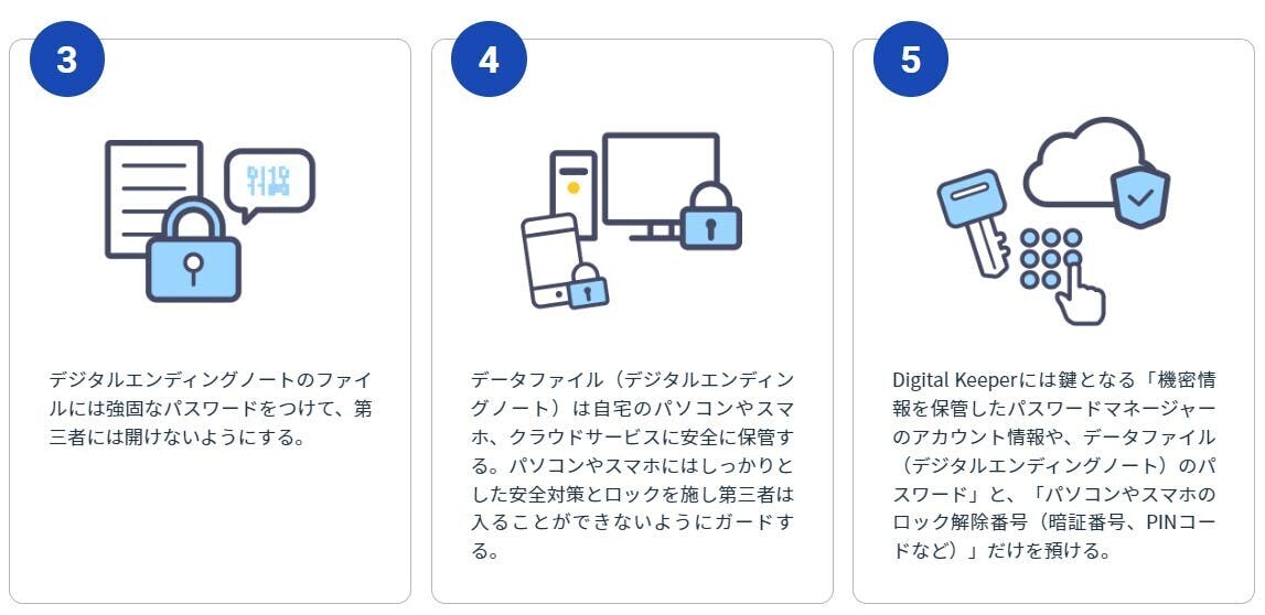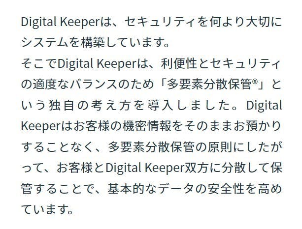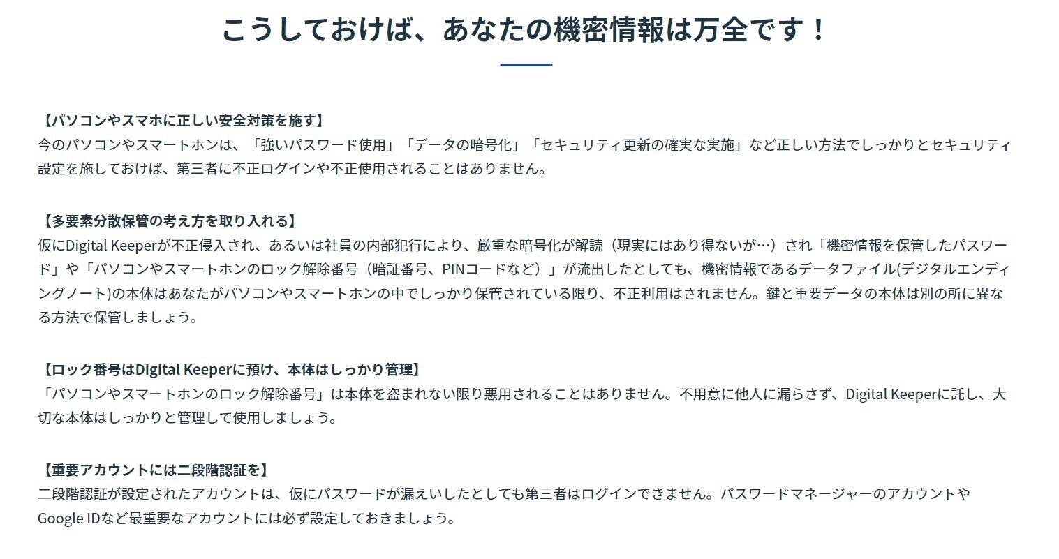 Digital Keeperは、故人の遺志(メッセージ)を預かる、ロック解除に必要な暗証番号を預かる、エンディングノートを作成して預かる、思い出の写真や動画を預かることが出来ます。生前はプライベートを守った管理が出来て、毎週お送りするお元気ですかメールにて利用者を見守り、本人の万が一の際には円滑に継承できるサービスは他にはありません。
