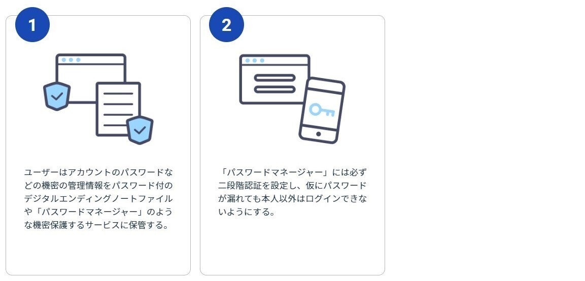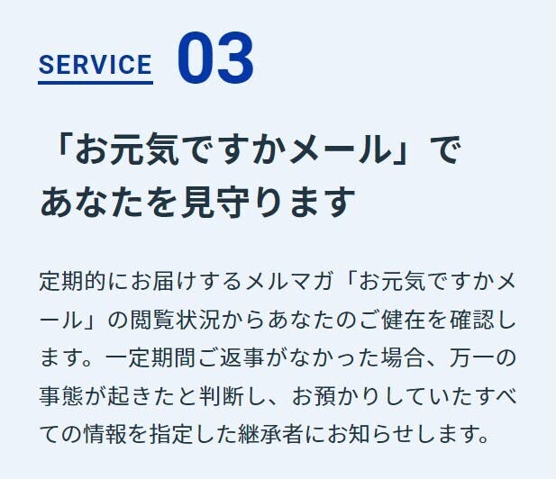 現在、当社が運営しているDigital Keeperでは「開かないスマホ」問題の解決に取り組んでおります。本人の万が一の際、あらかじめ指定した人にスマホなどのログイン情報を記した「デジタル資産継承通知書」をメール送信するサービスです。データ本体ではなく、データを開くためのパスワードやIDを預けておくイメージです。本人の万が一の際の判断については、毎週月曜日にお送りする「お元気ですかメール」に反応がなく、また一定期間の確認プロセスを経ても反応がない場合に、「万が一」の事態が発生したと判断して、家族・友人・同僚など事前に登録していた継承者に情報が通知される仕組みです。