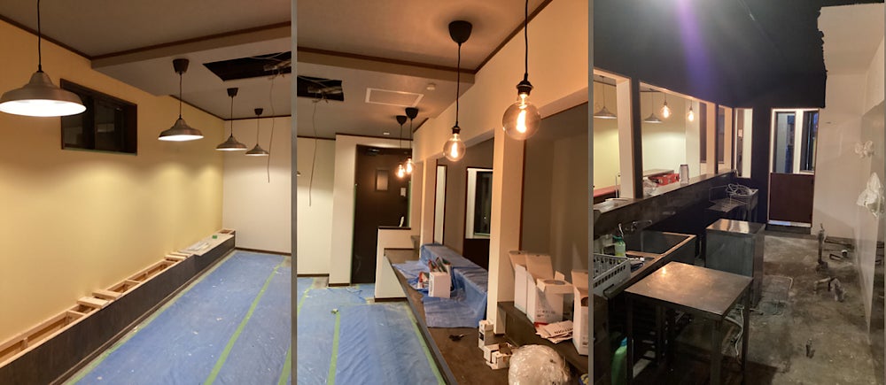 建物の改装は業者に依頼してプロの技術ですっかり綺麗に新築のようにして頂くことができました。明かりがないと作業ができないので照明も設置はしましたが、まだまだお店とは言い難い状況。