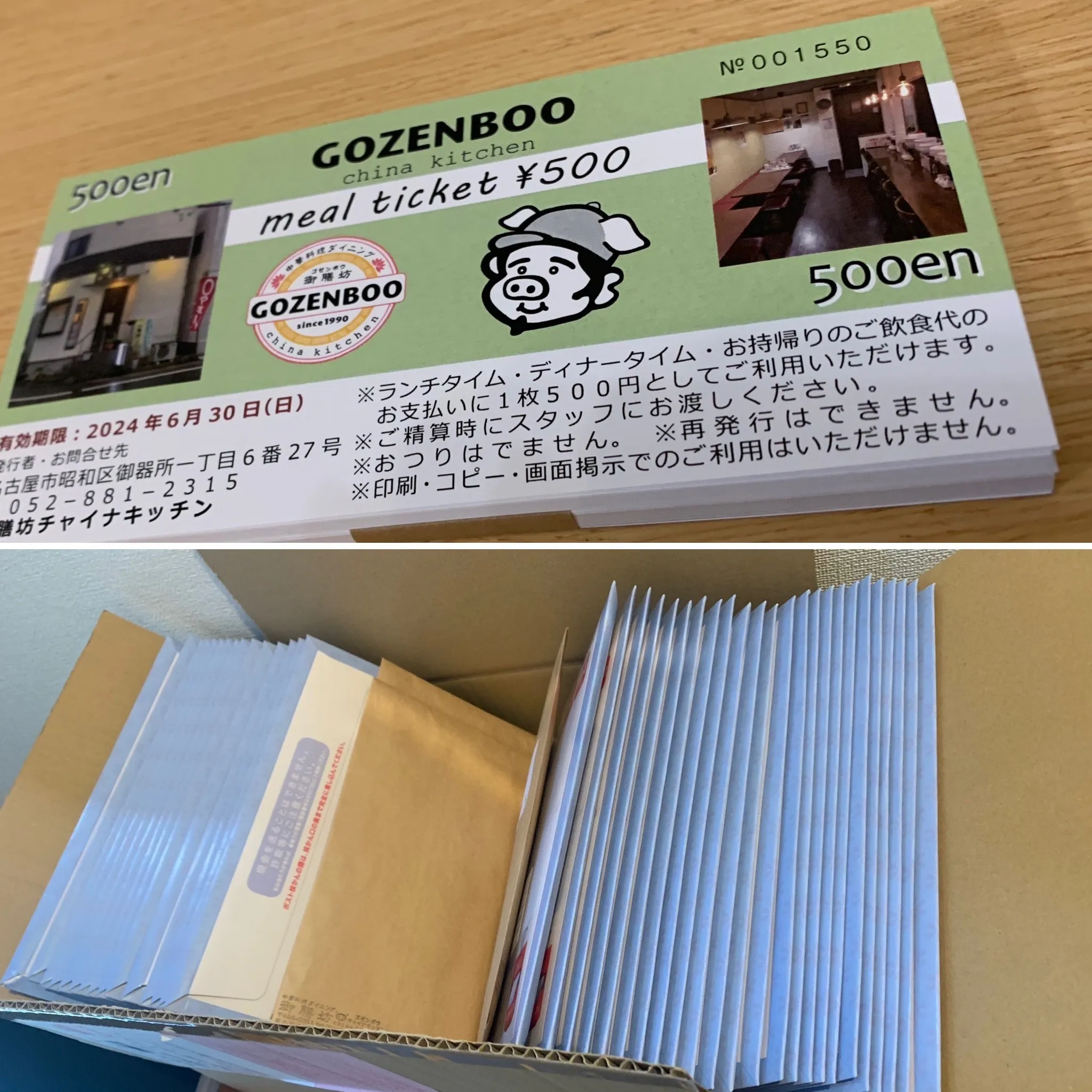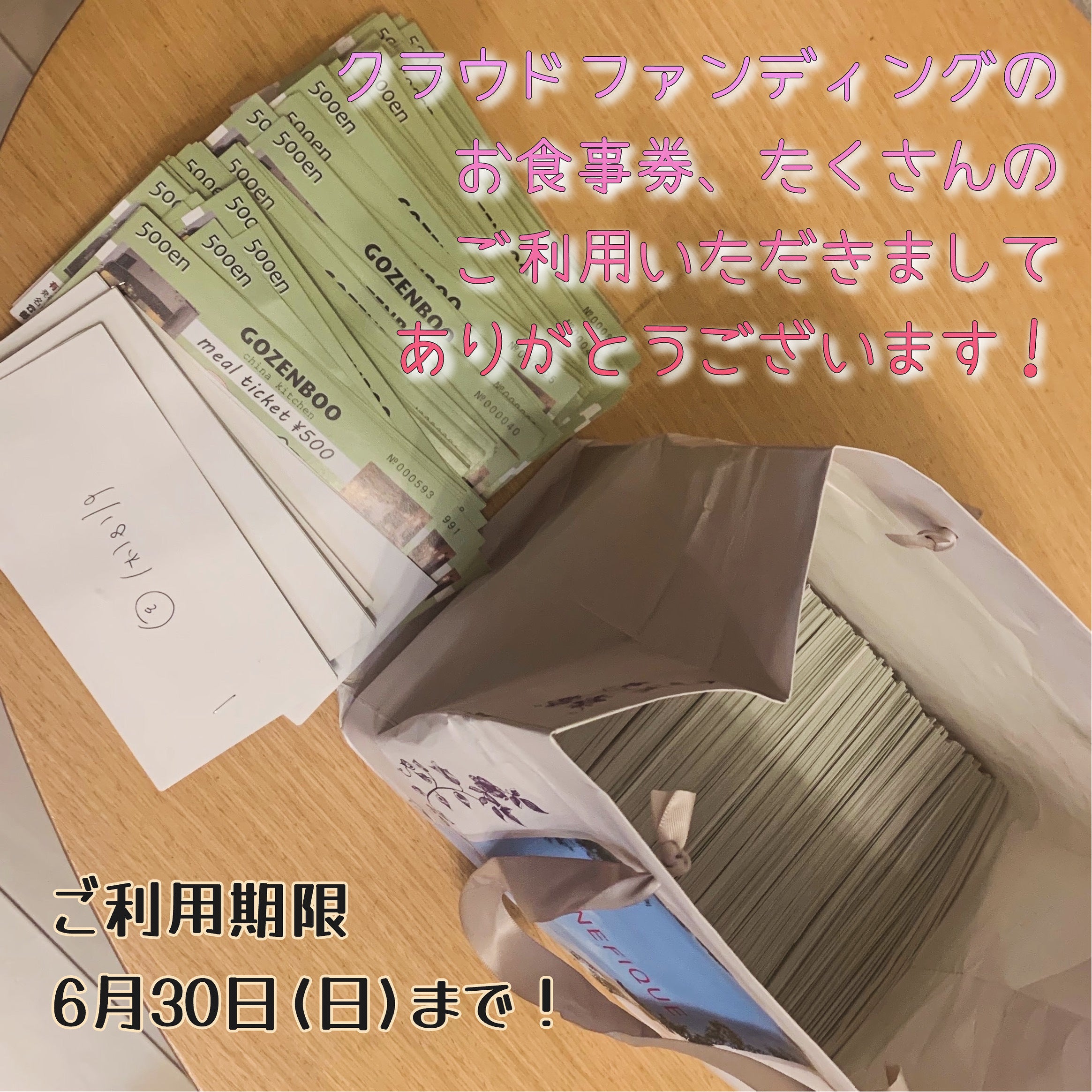 2023/05/11 20:27毎度お待たせ致しております。リターンのご飲食券のみをご選択の方とお箸をご選択の方には本日発送が完了致しました。オリジナルグッズを一緒にご選択の方とお見舞い等頂きました方々には、もう数日のお日にちを頂戴しております。こちらも発送が完了次第ご連絡させていただきます。1550枚印刷したご飲食券の山(写真撮り忘れた)が支援者の皆様の所に行って、そしてまたこちらの手元に戻ってくるのを楽しみにしております。 もっと見る