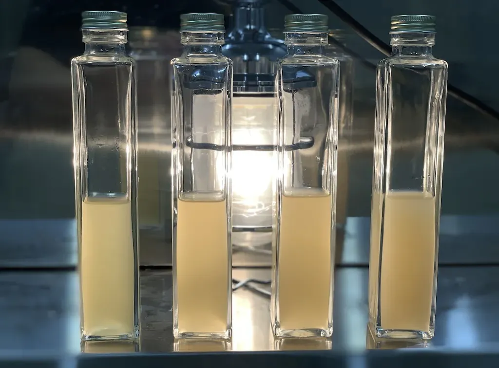 いちばん左側の試験管がスパっと!下部の澱(オリ)と上部に黄金色の液体に分離していますね。成功です!