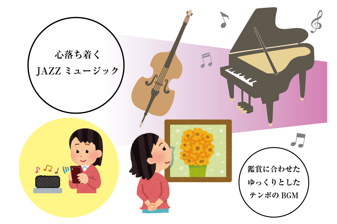 実は音楽があることによって無音の展示会場に一定のテンポ感で音楽を流して鑑賞する方が緊張感が解け、作品との交流を促したりするのに調べると心理学的にも重要な要素だということがわかりました。