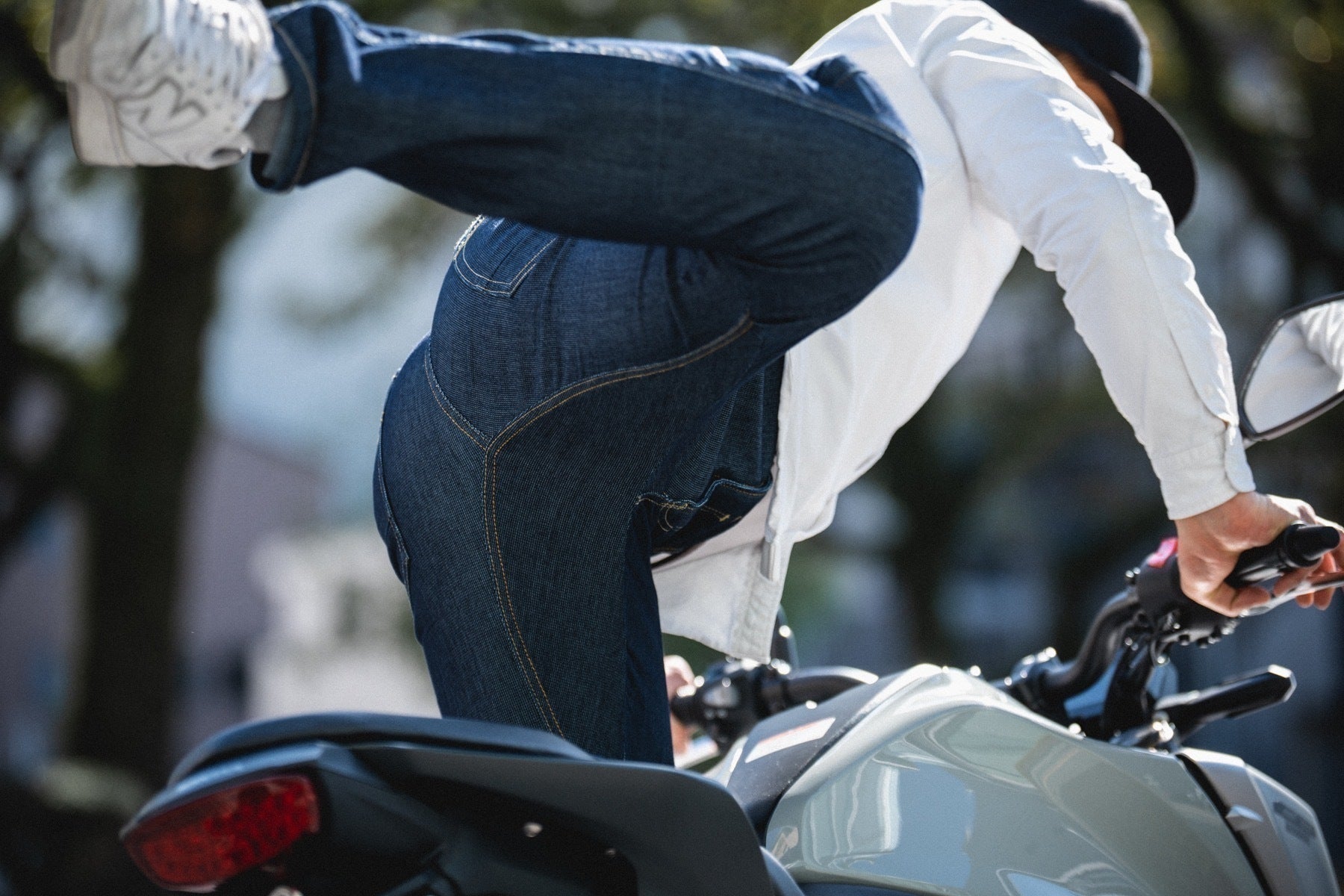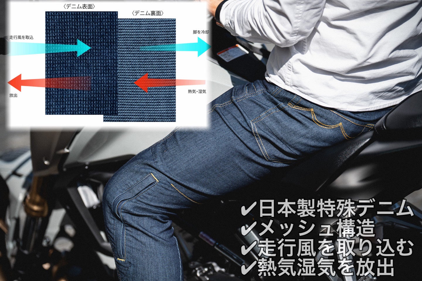 ・走行風を取り込み熱を放出する特殊構造のデニム。