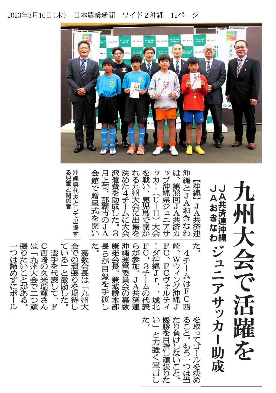 去る3月7日、JA会館にて九州大会へ派遣が決まったチームへの贈呈式があり、我がFC西崎から主将久米瑞輝が参加しました。