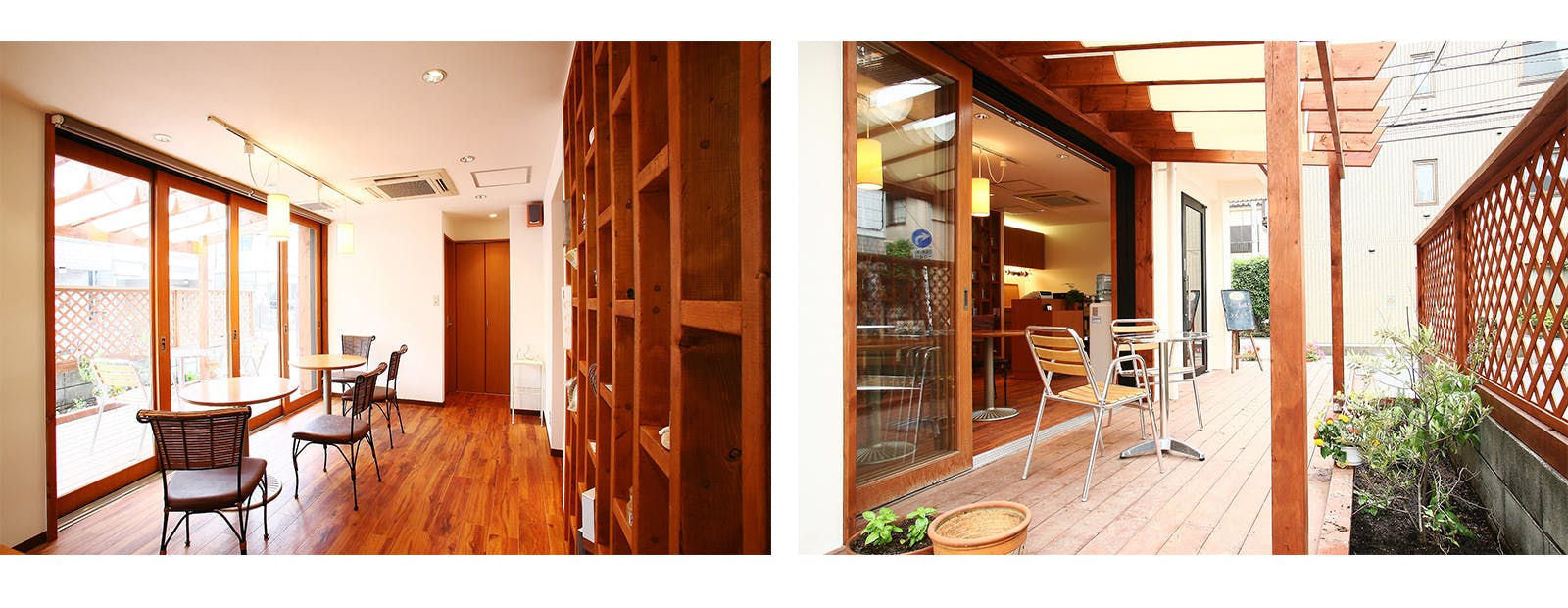 厨房の外にはカフェとして使っていた約18平米のサロン、そして屋外には日の差すウッドデッキがあり、テラス席としてご利用いただけます。