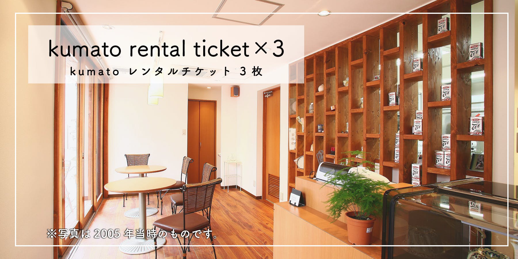 1枚につき、kumatoを4時間お使いいただけるチケットです。まとめて使って一日貸し切るもよし、日にちを分けて使ってもよし、ご自由にお使いいただけます。有効期限は2024年7月末まで。