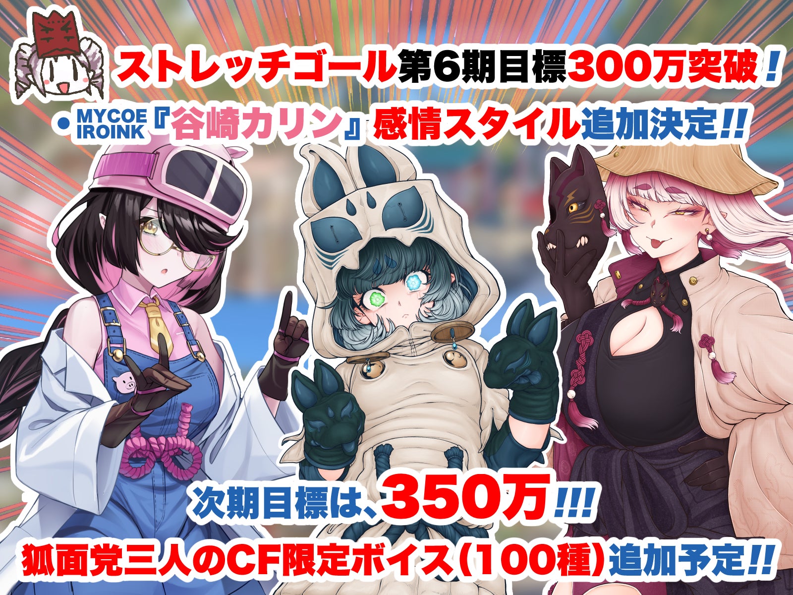 狐面党の三人……、八蜂鞠ククリ(CV:茉嶋とーか様)、涙目コロン(CV:みな様)、谷崎カリン(CV:茅本涼花様)の二次創作に利用可能なスペシャルボイス音源となります。