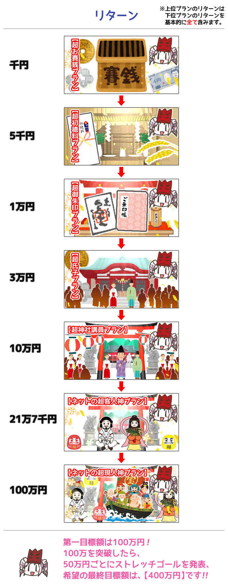 ──CF第一期目標が成功したら、順次リターン品の制作、そして超神社サミットの各種企画の準備を進めていくで〜!! 当日のお祭りが楽しいイベントになるよう超🌟頑張るので、ぜひ期待して待っていてな❢❢❢❢