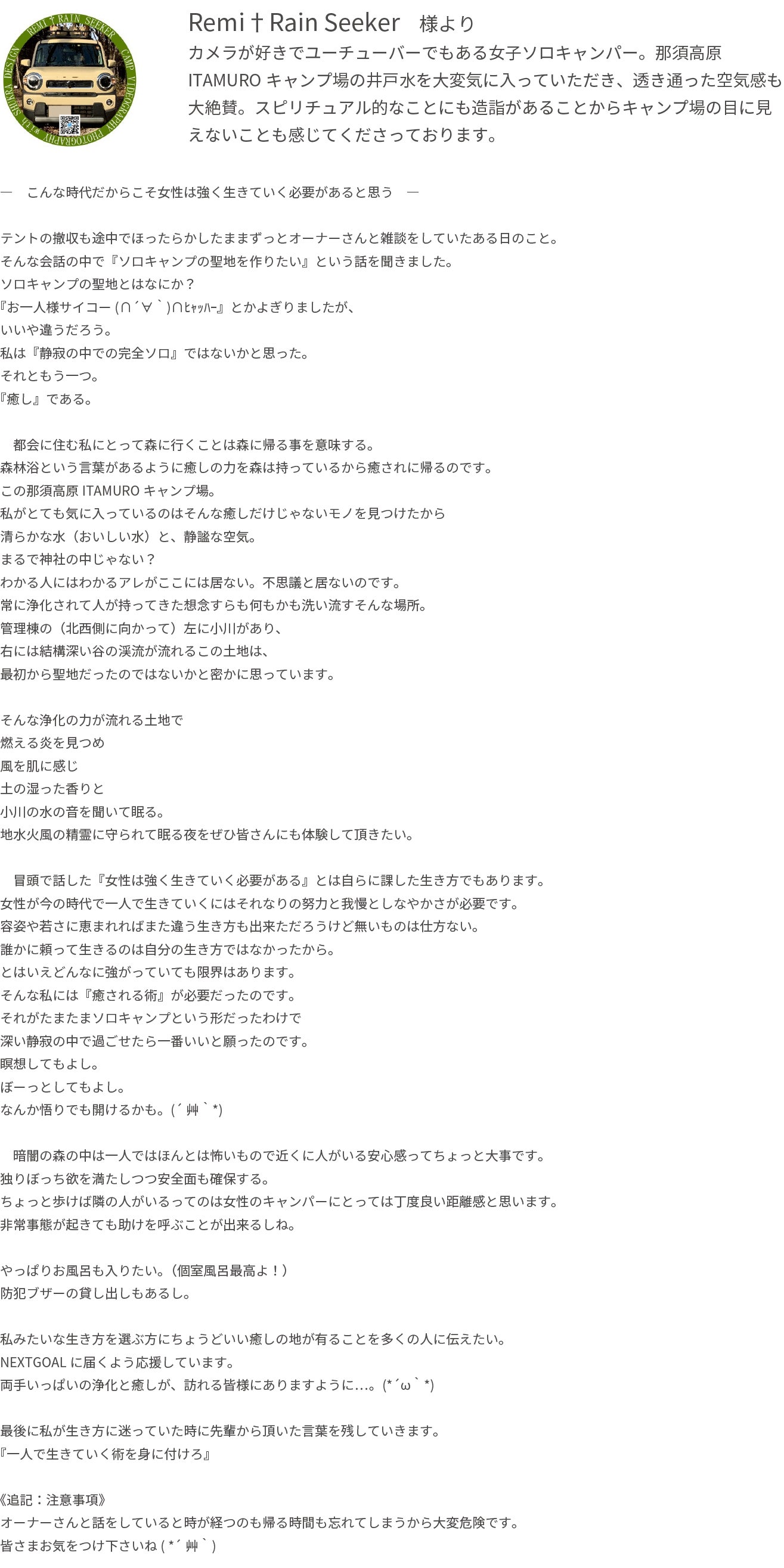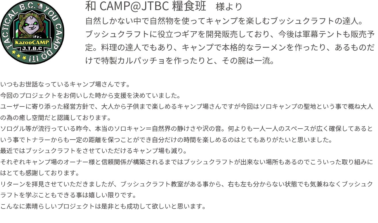 快適な環境の「日本一のソロキャンプの聖地」を造るためにも、ぜひとも皆々様方のご支援とご協力のほど、何卒よろしくお願い申し上げます!!