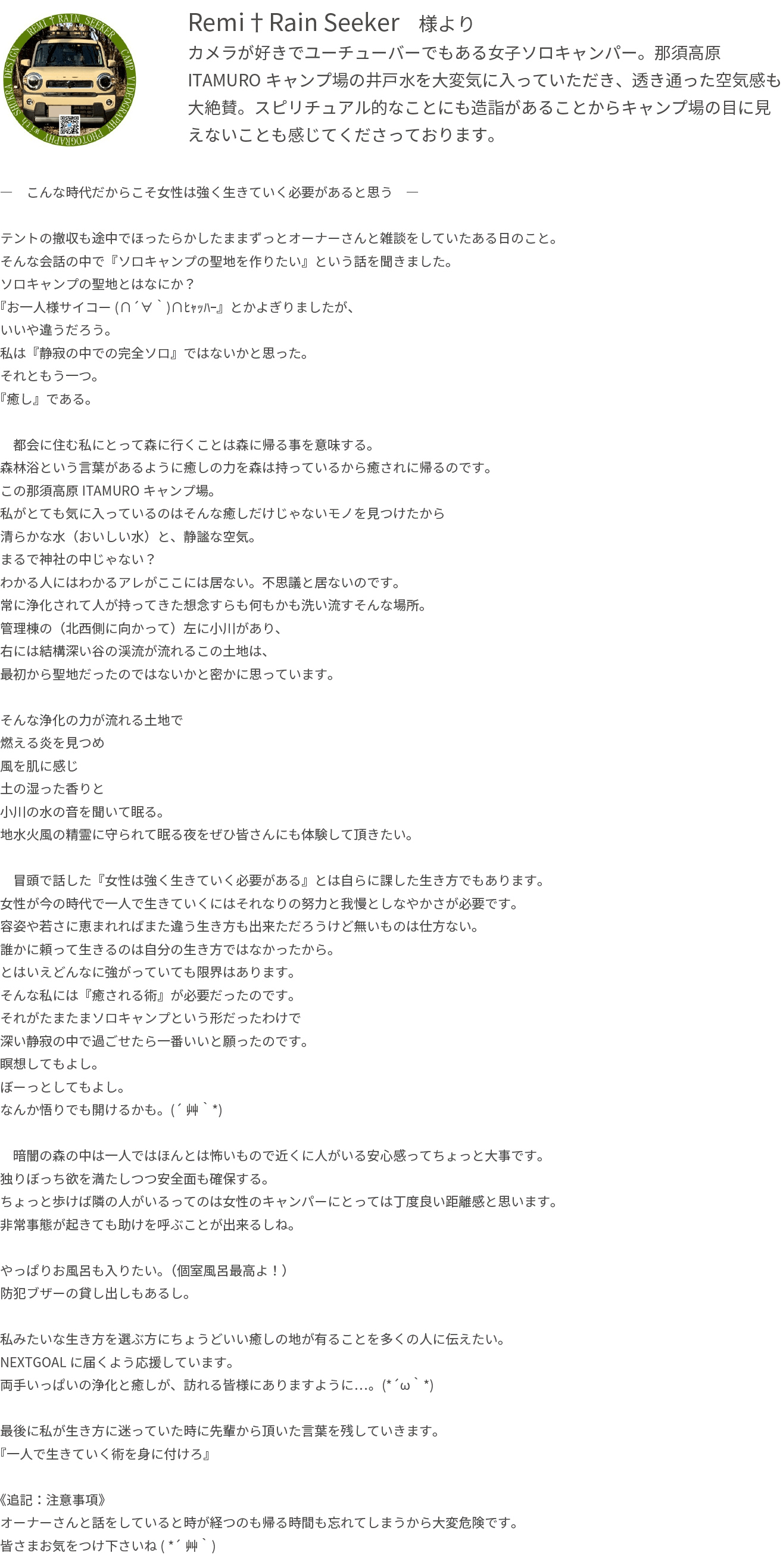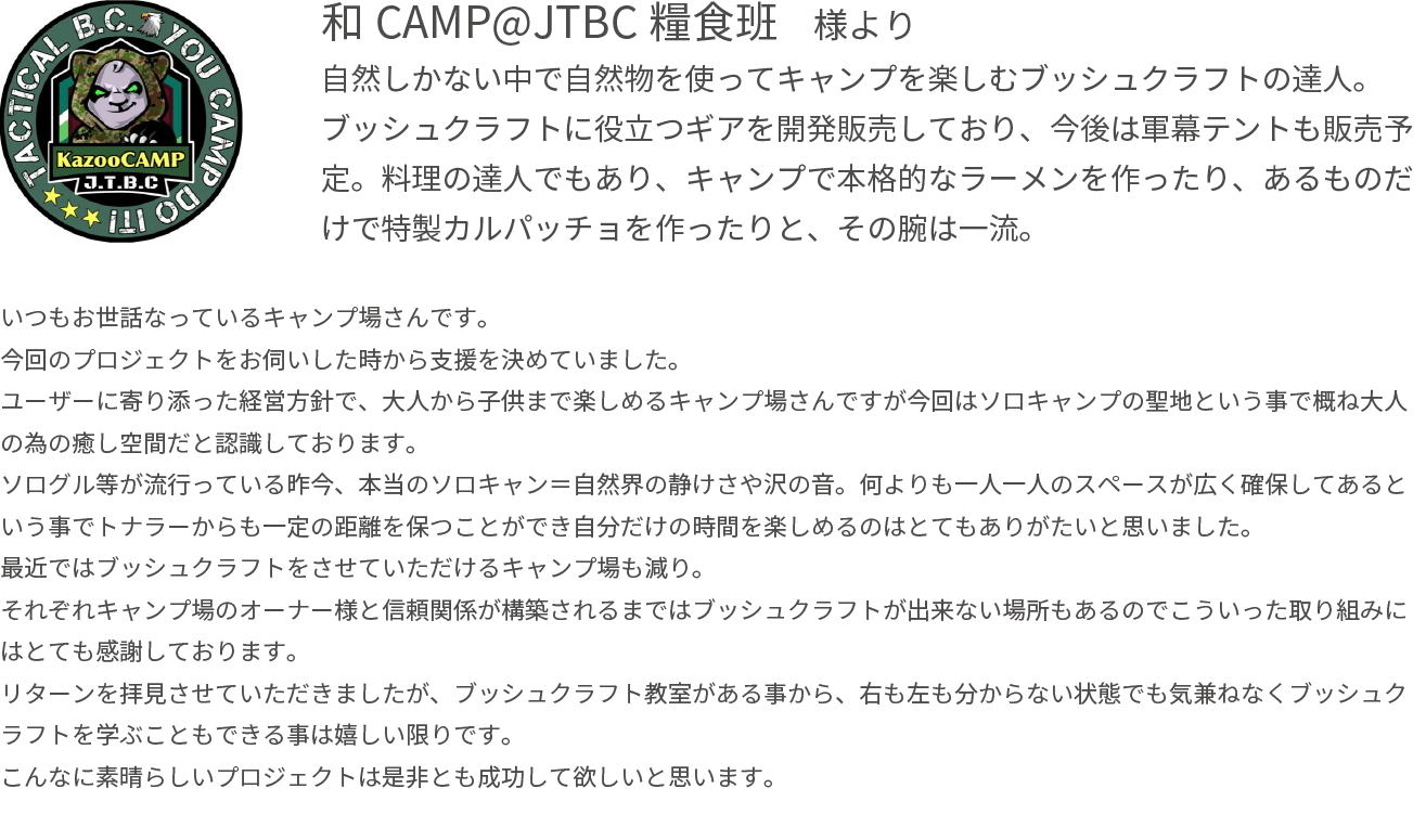 快適な環境の「日本一のソロキャンプの聖地」を造るためにも、ぜひとも皆々様方のご支援とご協力のほど、何卒よろしくお願い申し上げます!!