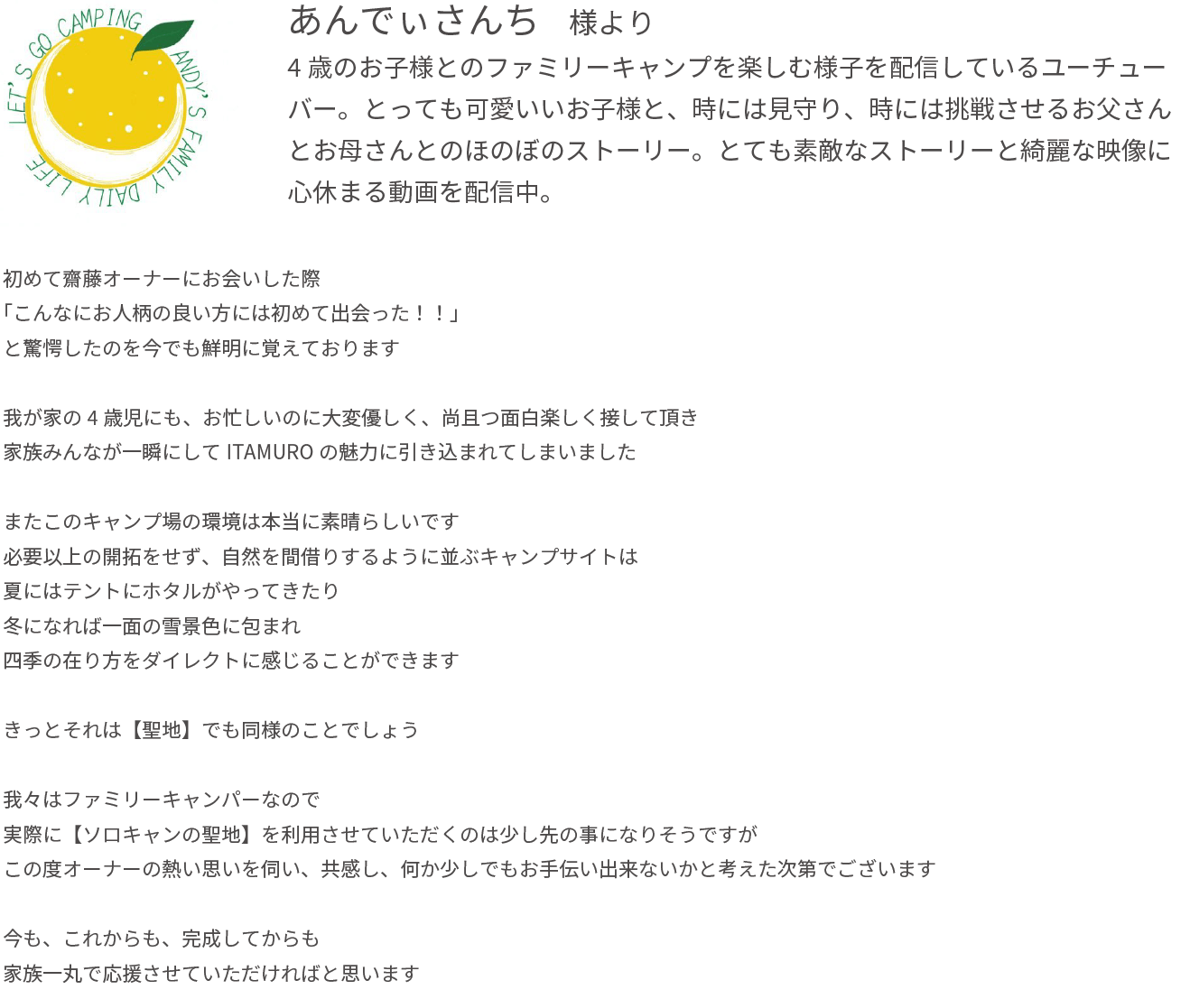 はじめまして。栃木県は那須高原にあります「那須高原ITAMUROキャンプ場」オーナーの齋藤です。