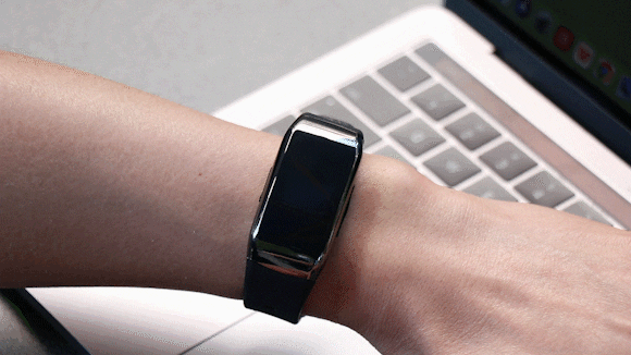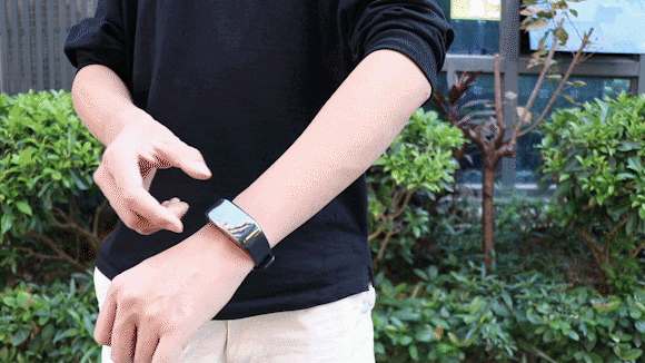 「X09」本体のサイズは5.6×1.4×2.6cmで、どこにでも持ち運びやすいのがポイントです。バンド付きの重さはたったの34g(約500円玉5枚分)で長時間腕に付けても負担を感じません。記録機能を使っていない場合、普通のデジタルウォッチとして時間を確認することもできます。