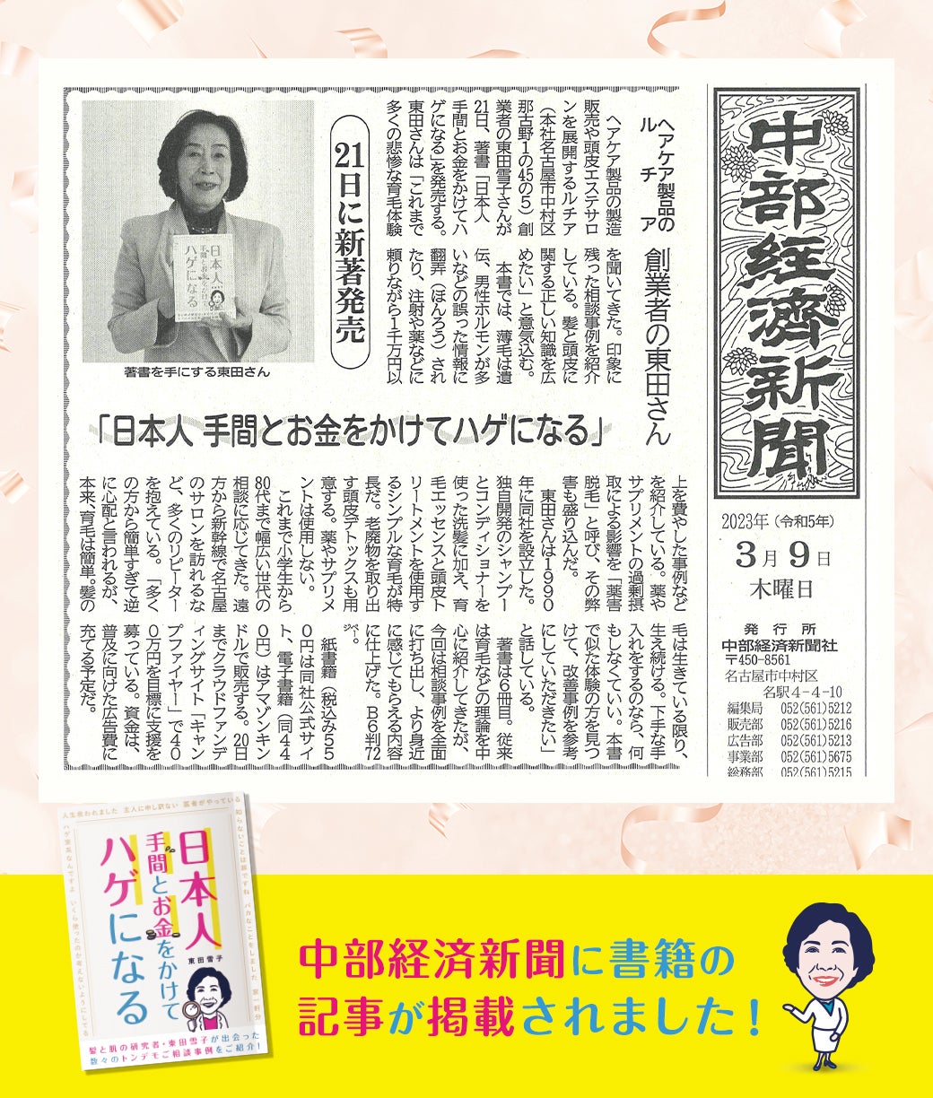 2023/03/09 15:17「日本人 手間とお金をかけてハゲになる」が中部経済新聞(2023年3月9日 発行)に記事が掲載されました! -------------- 記事全文をご紹介!-------------- ヘアケア製品の製造販売や頭皮エステサロンを展開するルチア(本社名古屋市中村区那古野1の45の5)創業者の東田雪子さんが21日、著書「日本人 手間とお金をかけてハゲになる」を発売する。東田さんは「これまで多くの悲惨な育毛体験を聞いてきた。印象に残った相談事例を紹介している。髪と頭皮に関する正しい知識を広めたい」と意気込む。本書では、薄毛は遺伝、男性ホルモンが多いなどの誤った情報に翻弄(ほんろう)されたり、注射や薬などに頼りながら1千万円以上を費やした事例などを紹介している。薬やサプリメントの過剰摂取による影響を「薬害脱毛」と呼び、その弊害も盛り込んだ。東田さんは1990年に同社を設立した。独自開発のシャンプーとコンディショナーを使った洗髪に加え、育毛エッセンスと頭皮トリートメントを使用するシンプルな育毛が特長だ。老廃物を取り出す頭皮デトックスも用意する。薬やサプリメントは使用しない。これまで小学生から80代まで幅広い世代の相談に応じてきた。遠方から新幹線で名古屋のサロンを訪れるなど、多くのリピーターを抱えている。「多くの方から簡単すぎて逆に心配と言われるが、本来、育毛は簡単。髪の毛は生きている限り、生え続ける。下手な手入れをするのなら、何もしなくていい。本書で似た体験の方を見つけて、改善事例を参考にしていただきたい」と話している。著書は6冊目。従来は育毛などの理論を中心に紹介してきたが、今回は相談事例を全面に打ち出し、より身近に感じてもらえる内容に仕上げた。B6判72ページ。紙書籍(税込み550円は同社公式サイト、電子書籍(同440円)はアマゾンキンドルで販売する。20日までクラウドファンディングサイト「キャンプファイヤー」で400万円を目標に支援を募っている。資金は、普及に向けた広告費に充てる予定だ。 もっと見る