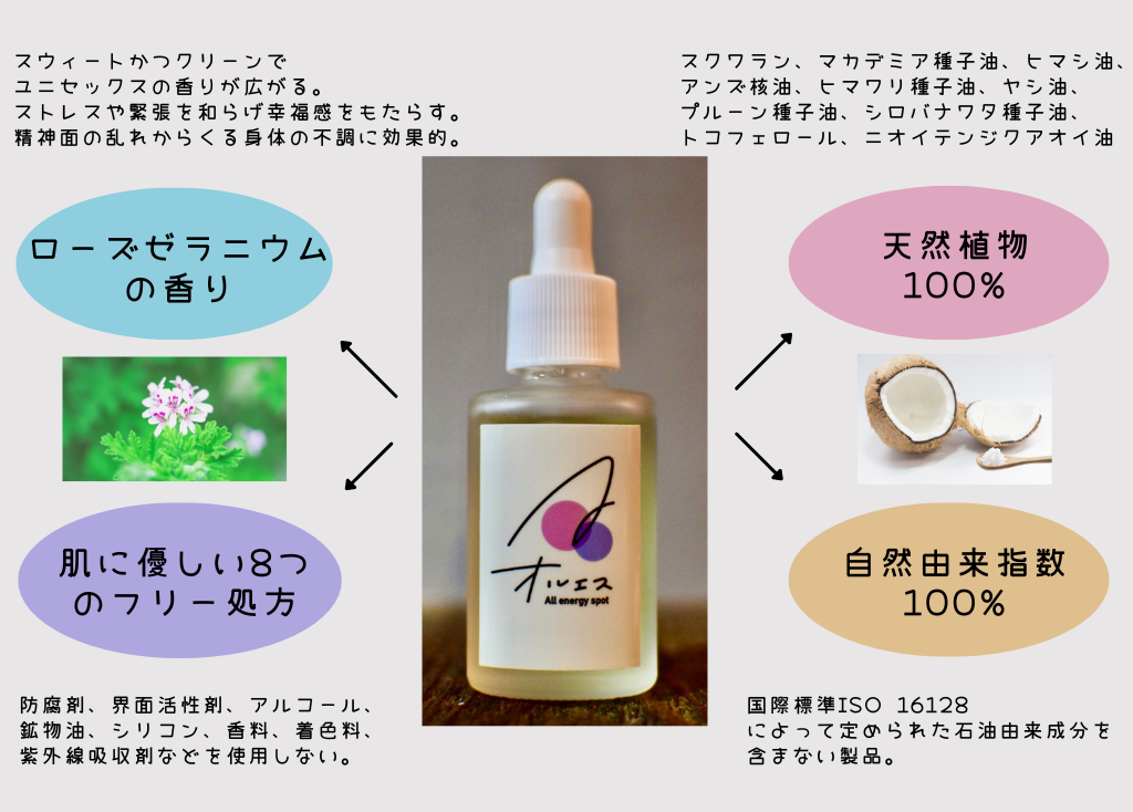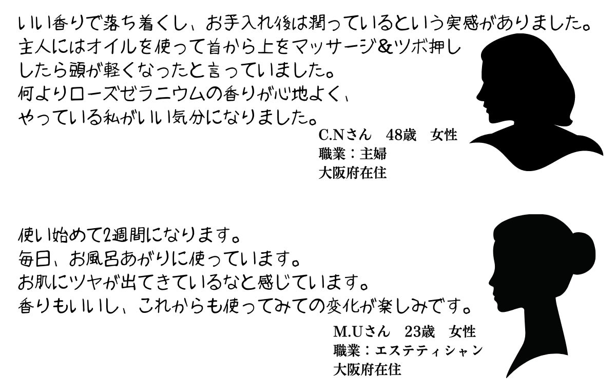 他社のデリケートゾーンケアオイルは無臭が多かったため、香りにもこだわりました。香りからもリラックス効果やホルモンの活性化、睡眠の質を上げるためにローズゼラニウムの心地よい香りにしました。