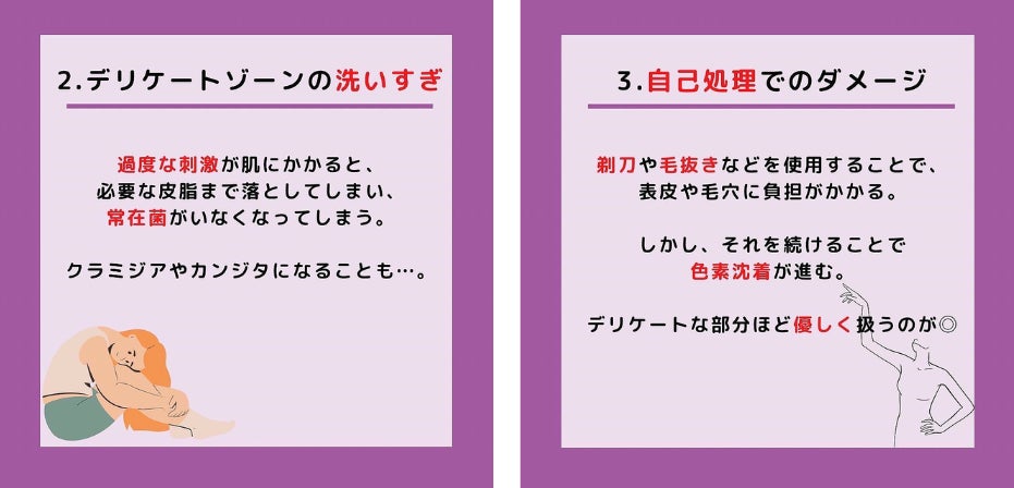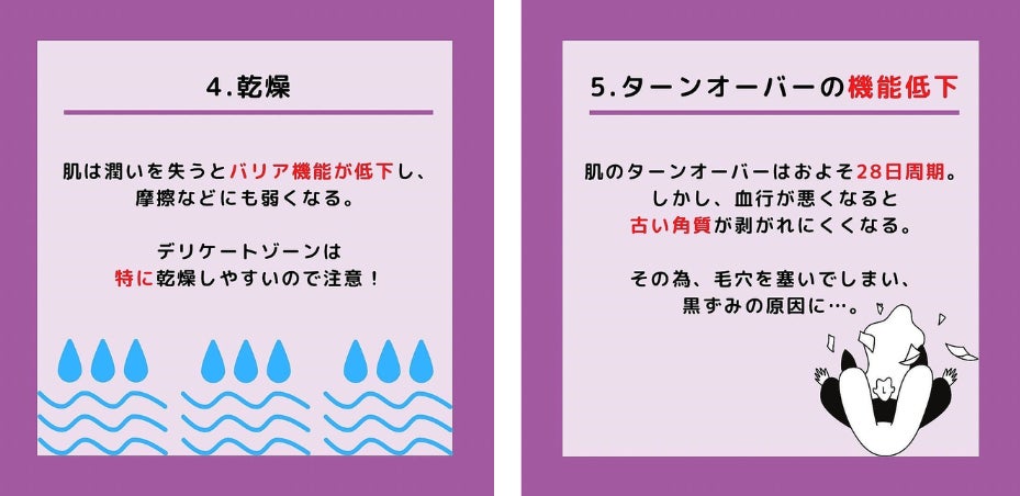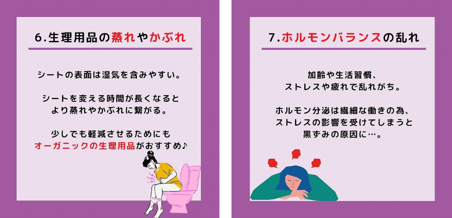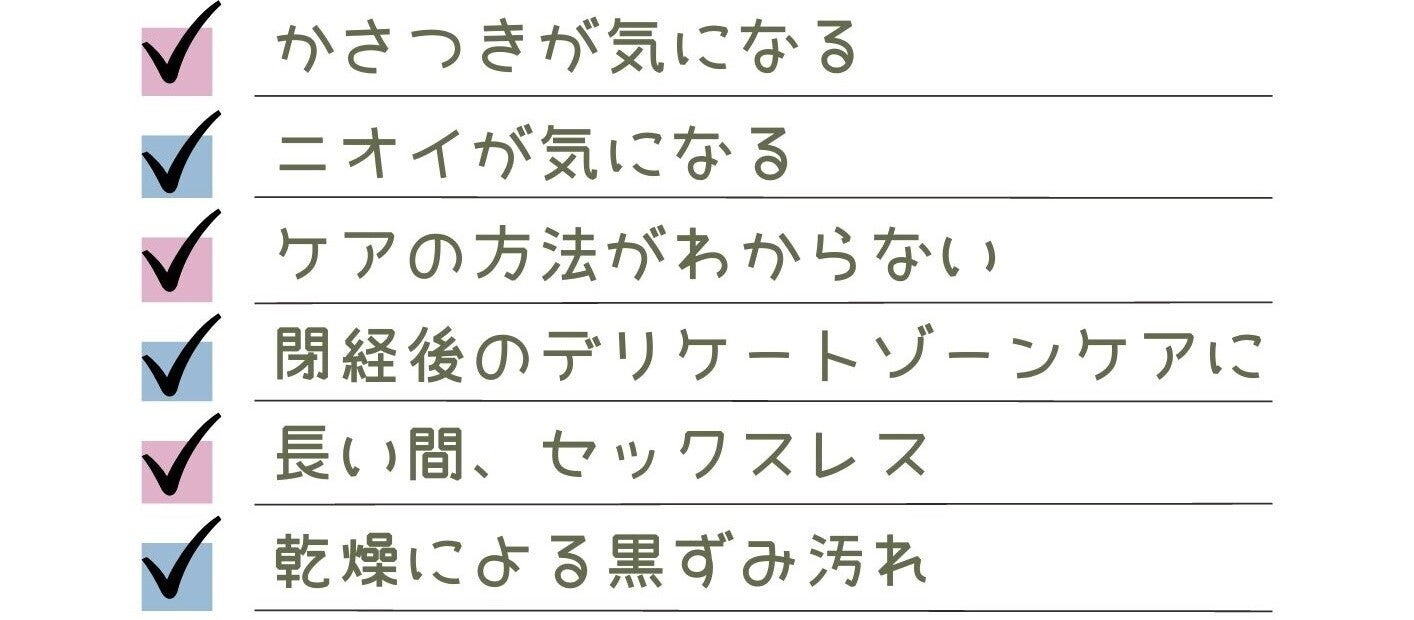 またデリケートゾーンが乾燥することで、痒みやニオイ、性交痛、血色が悪くなる、黒ずみなどを引き起こします。さらに女性の場合は経血コントロールができない、生理不順や生理痛の悪化などといった症状に発展することも。