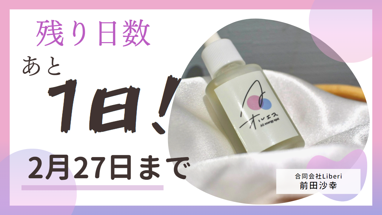 2023/02/26 19:30こんばんは!沙幸です!!いよいよ残すところあと1日になりました!!!(明日が最終日)全国各地から多くの皆様にご支援いただき、心から感謝しています。現在、55人の方々にご支援していただいております。「クラファン初めてだけど支援したい」という方、複数回支援してくださる方、愛のある応援メッセージを書いてくださる方などいて、本当に頭が上がりませんm(__)m大切な支援金を無駄なく、ベストな方法で活用していくにはどうすればいいかを日々考えながら、その責任を感じています。そして、何度もSNS拡散やチラシでの拡散という形で私を支えていただいた方々にも感謝です。あと1日、最後まで応援よろしくお願い致します! もっと見る