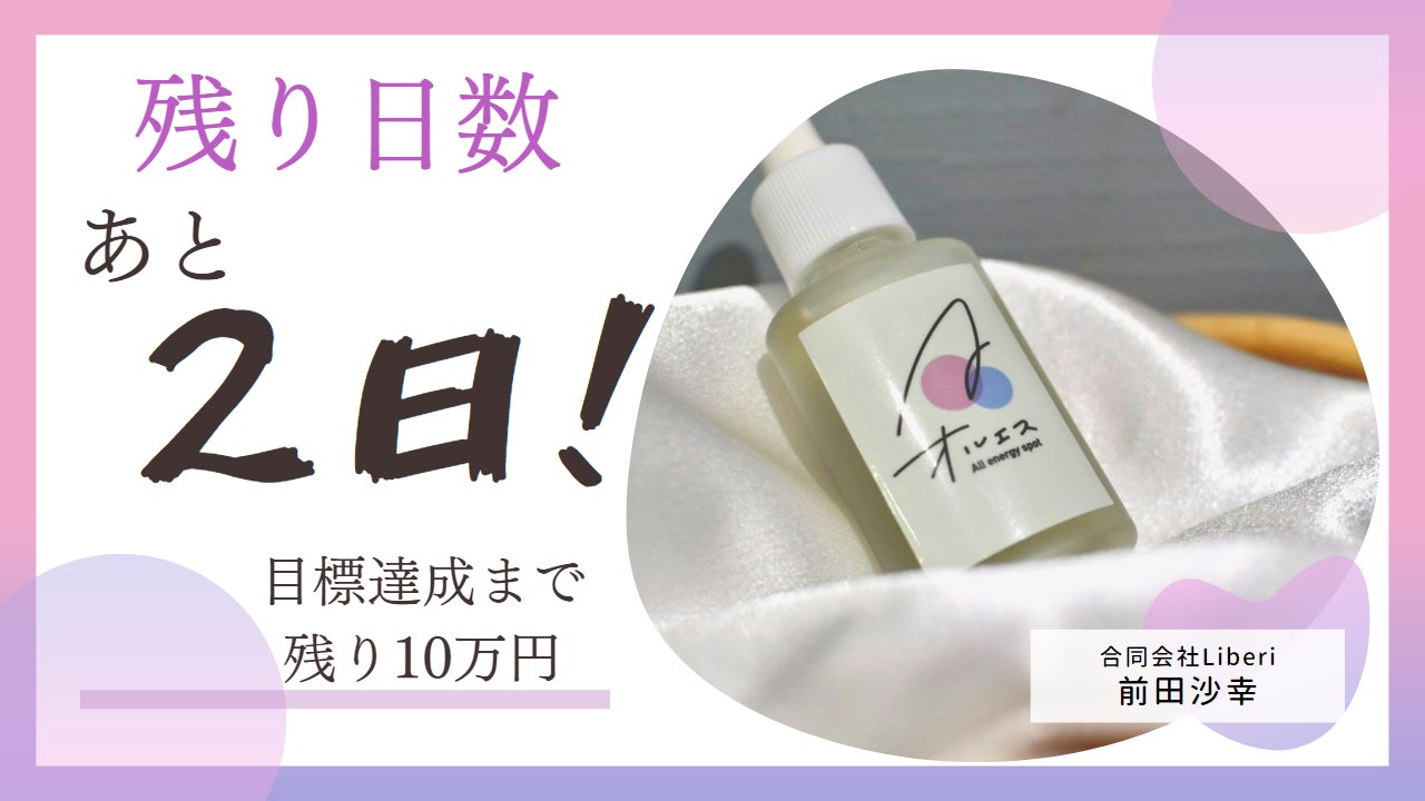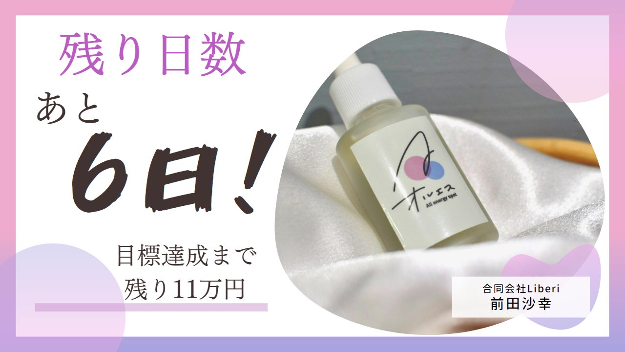 こんばんは!クラウドファンディング終了まで残り6日になりました。1週間切りましたね。本当に早く感じます。先日、オイルを奥様のために購入してくださった男性から嬉しいお言葉を頂きました。奥様は、生理痛がひどく、生理期間は仕事や家事をお休みするほど毎回しんどい思いをされていたそうなのですが、男性から『少しでも生理期間リラックスした気持ちで痛みも緩和できたらいいな』と思いプレゼントとして購入してくださいました。オイルを使用し始めた奥様は普段のオリモノの量が減り、次の生理期間が2日短くなり、出血量が減り、仕事も出勤できたそうです!その時、奥様から男性に『効果が出てとてもよかったけど、その想いが嬉しかったよ』と言ってもらい、男性までハッピーな気持ちになったとお話をしてくださりました。この話を聞いた時、私まで嬉しい気持ちになり、これからも伝え続けていきたいなと思えるきっかけになりました^^残りの期間も精一杯頑張ります。応援よろしくお願いします!!!